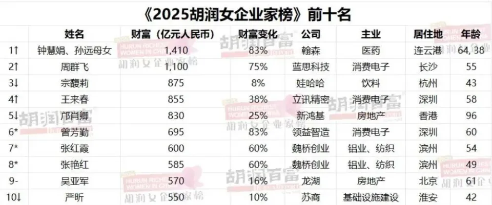每经编辑 :何小桃,杜宇 10月30日,胡润研究院颁布 《2025胡润女企业家榜》,列出了今年胡润百富榜中的前50名女企业家。 来自中国立异 药头部企业翰森的钟慧娟、孙远母女,以1410亿元财产初次成为中国女首富;蓝思科技周群飞财产增长470亿元,以1100亿元位列第二;宗馥莉以875亿元排名第三,较去年下降两位。