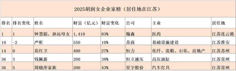地在江苏的上榜者  据《2025胡润女企业家榜》制表  马燕 栖身 地在江苏的上榜者有5家,分别 为:连云港(翰森)的钟慧娟、孙远母女,淮安(苏商)的严昕,姑苏 (恒力)的范红卫,常州(恒立液压)的钱佩新,常州(星宇股份)的周晓萍家族,对应的财产分别 为:1410亿元、550亿元、400亿元、200亿元、200亿元。 47位女企业家财产实现同比增加 ,仅5人出现缩水或持平。其中,翰森钟慧娟、孙远母女以640亿元的财产增量领跑,涨幅近乎翻倍,焦点驱动力来自立异 药研发加快、立异 产品 持续放量及全球互助稳步推动 ;消费电子领域的蓝思科技周群飞紧随其后,财产增加 470亿元。  新上榜人数增至8位,较去年 多3位。有8位“80后”进入榜单,其中40岁的瞿芳(小红书)为白手发迹,她成为本年榜单上“最年轻白手发迹女企业家”,其余7位均为财产继承。  扬子晚报/紫牛新闻记者 马燕 视频 马燕 校正 陶善工 |