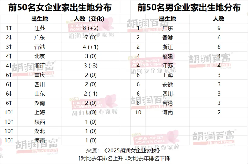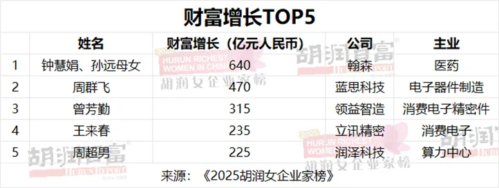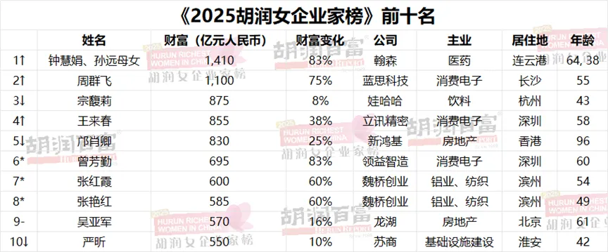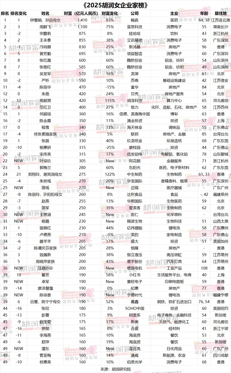 | 10月30日,胡润研讨 院宣布 《2025胡润女企业家榜》,列出了本年胡润百富榜中的前50名女企业家。与胡润百富榜总榜差别的是,女企业家榜单独盘算可从家族财产中剥离出的女企业家小我 财产。财产盘算截止日期为2025年9月1日。这是胡润研讨 院一连第20次宣布 此榜单。  栖身 地位于江苏连云港的翰森的钟慧娟、孙远母女,以1410亿元财产首次成为中国女首富,较去年 增加 640亿元(+83%),排名较去年 上升1位,同时二人也跻身《2025胡润百富榜》前30名。作为立异 驱动型制药龙头,翰森本年上半年实现营收74亿元,同比增加 14%。 得益于短视频热度与全球智能设备 需求释放 ,消费电子领域成为女企业家财产增加 的焦点动力。蓝思科技周群飞财产增加 470亿元,以1100亿元位列第二;立讯精密王来春与领益智造曾芳勤财产分别 上涨235亿元、315亿元,分别 以855亿元、695亿元位列第四和第六。娃哈哈宗馥莉以875亿元排名第三,较去年 降落两位。 《2025胡润女企业家榜》表现,前50名中国女企业家总财产达1.9万亿元,较去年 大年夜 幅上涨32%;榜单门槛同步提升至160亿元,较去年 增加40亿元(涨幅33%)。  出生地方面,苏商(8人)逾越粤商(7人)登顶,其中白手发迹女企业家中苏商占5席、粤商占4席。   栖身