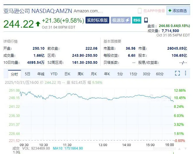 每经编辑:杜宇本地时光 10月31日,美股三大指数团体收涨,纳指涨0.61%;标普500指数涨0.26%;道指涨0.09%。 亚马逊大涨9.58%,股价创历史新高。其市值一夜增长2278亿美元(约合人平易近 币16213.43亿元)。财报数据