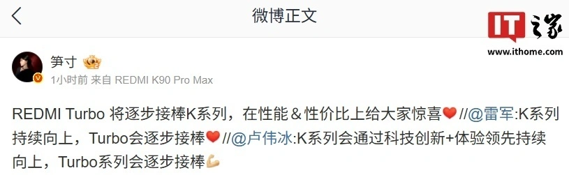 IT之家 11 月 1 日消息,博主 @数码闲聊站 本日爆料,某厂子系 9000mAh± 单电芯硅电池 + 100W 闪充计划 已搞定,实行室计划 积极评估 10000mAh±。批评 区网友推测为小米 REDMI Turbo 5 系列。 ![]() ![]() 小米集团合资人、总裁,手机部总裁,小米品牌总经理卢伟冰 10 月 25 日发文体现:“K 系列会经由进程 科技创新 + 体验领先持续向上,Turbo 系列会逐步接棒。”小米开办人,董事长兼 CEO 雷军也发文称:“K 系列持续向上,Turbo 会逐步接棒。” IT之家留意到,小米 REDMI 产品 经理笋寸对此举行了更详细的表白 说明,她体现:“Turbo 将逐步接棒 K 系列,在性能&性价比上给各人惊喜。” ![]() 作为参考,REDMI Turbo 现在最新的机型是 Turbo 4 系列,其中 标准版首发搭载天玑 8400-Ultra 芯片,采取 2.5D 微弧边框,配备 6550mAh 金沙江电池;Pro 版搭载首发骁龙 8s Gen4 芯片,配备 7550mAh 电池,搭载 6.83 英寸 1.5K LTPS 直屏,拥有 IP66/68/69 认证。 |
