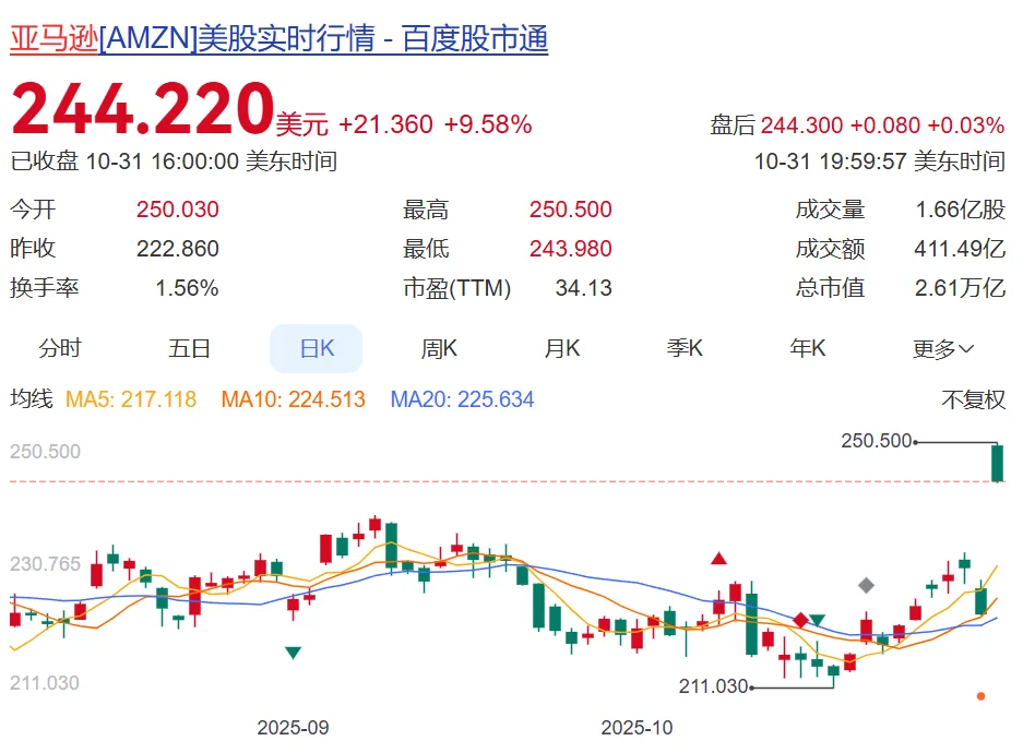 业绩超预期,亚马逊股价暴涨超9% 英伟达微跌,黄仁勋套现10亿美元 个股方面,奈飞涨逾2%;Meta跌超2%,微软跌超1%,英特尔、苹果、谷歌小幅下跌。Illumina Inc.涨超24%,创2012年1月份以来最年夜 单日涨幅。 特斯拉涨3.74%,报456.56美元,市值15184.36亿美元。 亚马逊年夜 涨9.58%,股价创汗青新高。其市值一夜增加 2278亿美元(约合国平易近 币16213.43亿元)。 ![]() 财报数据体现,亚马逊三季度营收同比增加 13%至1802亿美元,好于分析师均匀预期的1778亿美元。按部分划分,亚马逊云服务部分(AWS)销售额同比增加 20%至330亿美元,创下2022年以来的最年夜 增幅,同比增速及销售额分别高于分析师均匀预期的18%及324亿美元。净利润为212亿美元,较上年同期增加 39%。 预测未来,亚马逊预计,第四季 度营收将在2060亿美元至2130亿美元之间,即同比增加 10%至13%;预计业务利润将在210亿美元至260亿美元之间,上年同期业务利润为212亿美元。 英伟达报202.49美元,跌幅0.20%,市值49205.07亿美元。消息 面上,CEO黄仁勋完成了一项预先支配 的股票出售计划,自6月下旬以来累计套现高出10亿美元。据10月31日披露的文件,黄仁勋完成了末了一笔2.5万股的出售。这项交易是他于今年3月订定的一项计划的收尾,该计划旨在岁尾 前出售至多600万股股票。 黄仁勋的年夜 规模减持并非孤例。数据体现,随着股价屡立异 高,英伟达及其他受益于人工智能浪潮 的公司内部人士正在加速出售股票。 纳斯达克中国金龙指数收涨0.53%。蔚来涨超3%,小鹏汽车涨超2%,爱奇艺涨近2%;阿里巴巴跌超2%,京东跌近1%。 富时A50期指一连夜盘收涨0.19%,报15280点。 现货黄金跌0.51%,报4004.02美元/盎司,盘中一度跌破4000美元;COMEX黄金期货涨0.06%,报4013.4美元/盎司;现货白银跌0.54%,报48.66美元/盎司;COMEX白银期货跌0.66%,报48.25美元/盎司。 国际原油期货结算价小幅收涨。WTI原油期货结算价收涨0.68%,报60.98美元/桶。布伦特原油期货结算价收涨0.11%,报65.07美元/桶。