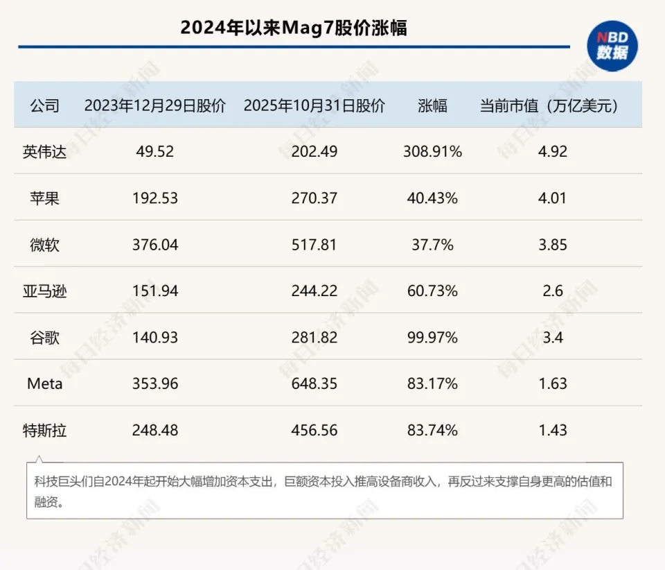 每经记者:岳楚鹏 每经编纂 :高涵得益于全球AI行业一连不停地加大投资和付出,10月29日,英伟达市值首次 突破5万亿美元,成为全球首家达成此成就的公司。然而数据显示,2024年以来,“科技七巨头”可以或许动