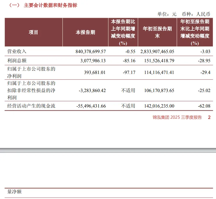 10月28日,锦泓集团 (603518)公布2025年三季报,公司业务收入为28.34亿元,同比下降 3.03%;归母净利润为1.14亿元,同比下降 29.4%;扣非归母净利润为1.06亿元,同比下降 25.02%;谋划现金流净额为1.42亿元,同比下降 62.
