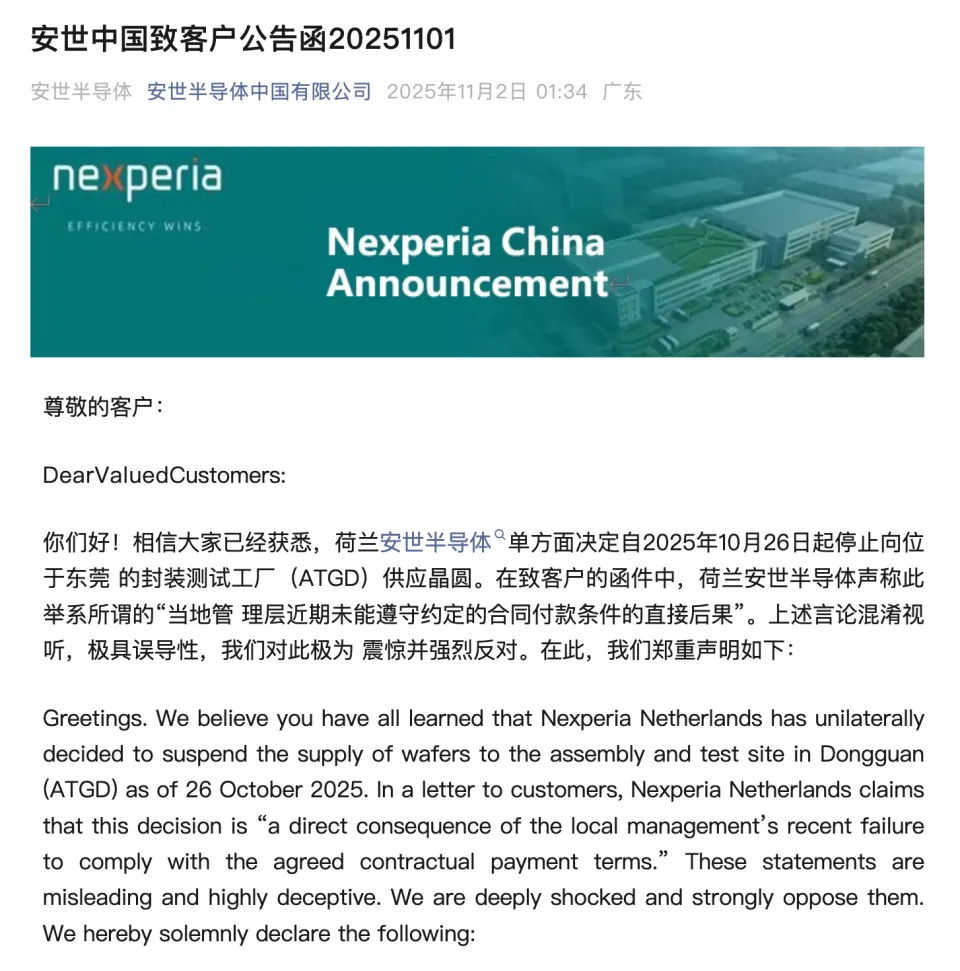 【TechWeb】11月2日消息,今天 破晓,安世半导体中国有限公司宣布 《安世中国致客户通知布告 函件20251101》。 ![]() 通知布告 称,荷兰安世半导体单方面决议 自2025年10月26日起制止向位于东莞的封装测试工厂(ATGD)供应 晶圆。在致客户的函件中,荷兰安世半导体声称此举系所谓的“本地管理层近期未能服从商定 的条约付款前提 的直接效果”。上述谈吐 肴杂视听,极具误导性,我们对此极为震动并强烈反对。在此,我们郑重声明如下: 1. 荷兰安世半导体所谓“本地管理层近期未能服从商定 的条约付款前提 ”美满是无中生有,恶意抹黑安世中国管理层。安世中国不存在违约举动;恰好相反,荷兰安世半导体目前欠付ATGD的货款高达10亿元人平易近 币。 2. 荷兰安世半导体相关管理层在决议历程 中严重失职失责,将个人利益凌驾于公司整体利益之上,严重违反职业操守和公司管理要求,由此给公司、广大员工造成的损失,应依法承担义务 。 3. 荷兰安世半导体单方面制止供货的举动,完全置客户利益于掉臂,严重违反条约商定 和商业合作原则,严重破坏了客户信托,是极其不负义务 的做法。 4. 目前,安世中国已建立充足的成品与在成品库存,能够 稳固、持续地满足广大客户直至岁尾 以致更长时间的订单需求,供应 链平安 靠得住 。为确保供应 的恒久性与韧性,我们已积极启动多套预案,正在加紧验证新的晶圆产能。我们对在短期内完成验证、并自明年起无缝连接 满足全体 客户需求布满信心。 另据央视消息11月1日消息,商务部消息谈话 人就安世半导体相关问题应询答记者问。商务部消息谈话 人体现,此前,中方已就安世半导体相关问题回应了有关记者的提问。我想夸张 的是,荷兰政府对企业内部事件的不妥干涉 ,导致了目前环球产供链的杂乱。中国作为负义务 的大国,充分思量国内国际产供链平安 稳固,欢迎碰到现实艰苦 的企业实时与商务部或处所 商务主管部门联系。我们将综合思量企业现实环境,对符合前提 的出口予以宽免。 以下为《安世中国致客户通知布告 函件20251101》原文: 尊重的客户: DearValuedCustomers: 你们好!相信大家已经获悉,荷兰安世半导体单方面决议 自2025年10月26日起制止向位于东莞 的封装测试工厂(ATGD)供应 晶圆。在致客户的函件中,荷兰安世半导体声称此举系所谓的“本地管 理层近期未能服从商定 的条约付款前提 的直接效果”。上述谈吐 肴杂视听,极具误导性,我们对此极为 震动并强烈反对。在此,我们郑重声明如下: Greetings. We believe you have all learned that Nexperia Netherlands has unilaterally decided to suspend the supply of wafers to the assembly and test site in Dongguan (ATGD) as of 26 October 2025. In a letter to customers, Nexperia Netherlands claims that this decision is “a direct consequence of the local management’s recent failure to comply with the agreed contractual payment terms.” These statements are misleading and highly deceptive. We are deeply shocked and strongly oppose them. We hereby solemnly declare the following: 1.荷兰安世半导体所谓“本地管理层近期未能服从商定 的条约付款前提 ”美满是无中生有,恶意抹黑安 世中国管理层。安世中国不存在违约举动;恰好相反,荷兰安世半导体目前欠付ATGD的货款高达 10 亿元人平易近 币。 1.Nexperia Netherlands’s claim that “local management’s recent failure to comply with agreed contractual payment terms” is entirely fabricated and constitutes malicious defamation against Nexperia China’s management. Nexperia China has not breached any contracts; on the contrary, Nexperia Netherlands currently owes ATGD over RMB 1 billion in outstanding payments. 2.荷兰安世半导体相关管理层在决议历程 中严重失职失责,将个人利益凌驾于公司整体利益之上,严 重违反职业操守和公司管理要求,由此给公司、广大员工造成的损失,应依法承担义务 。 2.The relevant management team at Nexperia Netherlands have demonstrated severe dereliction of duty in decision-making, putting personal interests over the company’s overall interests. This action gravely violates professional ethics and corporate governance requirements. They must bear legal responsibility for the losses inflicted upon the company and its employees. 3.荷兰安世半导体单方面制止供货的举动,完全置客户利益于掉臂,严重违反条约商定 和商业合作原则,严重破坏了客户信托,是极其不负义务 的做法。 3.Nexperia Netherlands’s unilateral suspension of supply completely disregards customer interests,severelyviolatescontractual agreementsandcommercial cooperationprinciples, and gravely undermines customer trust. This is an extremely irresponsible act. 4.目前,安世中国已建立充足的成品与在成品库存,能够 稳固、持续地满足广大客户直至岁尾 以致更长 时间的订单需求,供应 链平安 靠得住 。为确保供应 的恒久性与韧性,我们已积极启动多套预案,正在加 紧验证新的晶圆产能。我们对在短期内完成验证、并自明年起无缝连接 满足全体 客户需求布满信心。 4.At present, Nexperia China has established sufficient inventories of finished goods and work-in-progress, enabling stable and sustained fulfillment of customer orders through year-end and beyond. Our supply chain remains secure and reliable. To ensure long-term supply resilience, we have proactively initiated multiple contingency plans and are accelerating the qualification of new wafer supply sources. We are confident in completing this qualification shortly and seamlessly meeting all customers’ demands starti