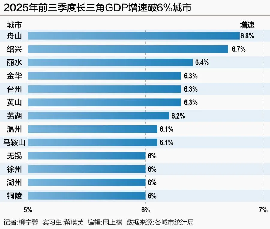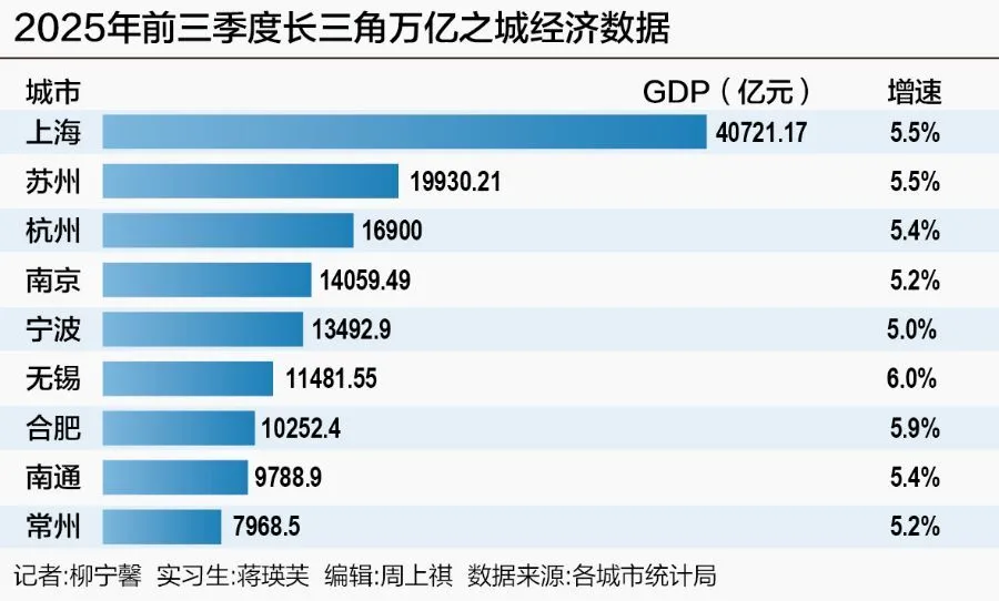 21世纪经济报道记者柳宁馨 训练生蒋瑛芙 杭州报道 长三角GDP约占天下四分之一,产业新动能、消耗新潜力持续出现 。 今年前三季度,江苏、浙江、上海、安徽四地GDP总量达251797.17亿元,约占天下GDP总量的25%,经济稳中向好。 同期,长三角41座都邑 中,28座都邑 经济增速跑赢天下平均(5.2%),13座都邑 经济增速冲破 6%,7座都邑 GDP规模超过1万亿元,经济规模由高到低别离 为:上海、苏州、杭州、南京、宁波、无锡、合肥。 ![]() 长三角经济布局继续优化,积贮新动能,先进制造业发挥 紧张支撑。前三季度,上海人工智能、集成电路两大年夜 集群产值增速均对峙 两位数增加 。同期,江苏全省规模以上高技术制造业、数字核心产物制造业均对峙 两位数增加 ;安徽高技术制造业增加 值增加 27.8%。 消耗市场稳步恢复,也为长三角注入更多内生动力。前三季度,以旧换新等政策开释潜力,绿色消耗渐渐鼓起,“苏超”、“浙BA”等都邑 体育赛事发达发展 ,让长三角提振消耗有了不少新亮点,也创造更多新模式。 13城经济增速破6%前三季度,浙江以5.7%的GDP增速领跑,上海、江苏、安徽紧随厥后,别离 为5.5%、5.4%、5.4%,三省一市经济增速均跑赢天下平均。 从规模看,前三季度,江苏以102811亿元的GDP总量在长三角三省一市排在第一,浙江排第二,GDP为68495亿元,上海GDP总量为40721.17亿元,安徽则为39770亿元。 江苏省社科院社会政策所所长张春龙告诉21世纪经济报道记者,先进制造业是江苏经济的“压舱石”,筑牢了GDP规模与增速优势,其支撑感化 表现在产业布局优化与抗风险能力提升上,为经济增加 供给 稳定动能。 “在环球需求颠簸背景下,江苏制造业的技术沉淀、产业链完备性与数字转型优势明显,叠加国内市场支撑,只要持续强化创新与供应链韧性,‘硬核制造’ 优势将进一步放大年夜 ,巩固长三角经济龙头地位。”张春龙说。 在长三角41座都邑 中,前三季度共有13座都邑 经济增速冲破 6%,由高到低别离 为舟山、绍兴、丽水、金华、台州、黄山、芜湖、温州、马鞍山、无锡、徐州、湖州、铜陵。 在这13座GDP增速破6%的长三角都邑 中,前5名全部 是浙江都邑 ,浙江都邑 一共有7座入榜,安徽有4座都邑 增速超6%,江苏有徐州、无锡两座都邑 均以6%增速卡位榜单。 浙江这些经济快速增加 的都邑 ,大年夜 多有着基于块状经济打下的坚固制造业基础,也在今年快速推进传统产业向新发展 ,目前看已有开端成效。 “十五五”计划 发起在战略使命第一条“建设现代化产业体系 ,巩固壮大年夜 实体经济基础 ”中,首个使命就是优化提升传统产业。 浙大年夜 宁波理工商学院副院长李雪艳在接受21世纪经济报道记者采访时表现,当前,浙江正借助创新推动传统产业举行 “内生裂变”,这紧张基于浙江工业经济三大年夜 特点,一是坚固的传统产业“根本盘”,二是雄厚的“块状经济”基础,三是布满活气 的平易近 营经济主体。 浙江在推进传统企业继续向“新”方面有哪些可探索方向,对其他地域都邑 有何借鉴? 在李雪艳看来,传统产业可以基于块状特色、集群化特色,团结数字赋能,拓展新的空间和范畴,一是链式裂变,集群发展 ,二是创新裂变,技术攻坚,三是转型裂变,数智赋能,四是增值裂变,拓展新域。浙江省政策明确哀求 推进传统产业数智化改造,开展“人工智能+”举措,建设一批智能工厂和未来工厂。同时,鼓励企业在服从主业的同时,开发新营业 板块。 李雪艳认为 ,为了保障传统产业内生裂变,还必要积极的轨制 创新,比方正在推进的天下统一大年夜 市场建设、“留商即招商”的服务 理念等。 长三角共有9座万亿GDP都邑 。从经济规模看,上海、苏州、杭州、南京、宁波、无锡、合肥等7座都邑 前三季度GDP冲破 1万亿元,南通以9788.9亿元紧随厥后,常州这座新晋万亿之城在前三季度实现7968.5亿元的GDP规模。 ![]() 前三季度,上海以40721.17亿元的GDP规模遥遥领先,信息服务 业对经济增加 进献 明显。前三季度,上海第三产业占GDP比重到达79.1%,继续发挥 主引擎感化 ,其中 ,信息传输、软件和信息技术服务 业增加 值同比增加 15.5%。 苏州则以“新型工业化”为主攻方向,以“创新转型”为核心动力,前三季度以19930.21亿元的GDP总额位列第二。前三季度,苏州规上高新技术产业产值到达20096.5亿元,同比增加 6.3%,其中 ,苏州的光电子器件、工业机器人和锂电池等新三样产物产量别离 增加 10.0%、20.6%和55.9%,成为推动工业增加 的新引擎。 先进制造、消耗双轮驱动从产业布局看,长三角三省一市出现 服务 业与制造业并进,数字经济、绿色产业快速增加 的特点。先进制造业成为带动长三角经济增加 的核心动力,产业向高技术化、智能化、绿色化方向快速转型。 新兴产业渐渐成为工业增加 主引擎,上海的工业底盘在快速换挡。前三季度,上海三大年夜 先导产业制造业产值同比增加 8.5%,其中 ,人工智能制造业增加 12.8%,集成电路制造业增加 11.3%。目前,上海工业战略性新兴产业产值占全市工业总产值的比重已经提高至44.1%。 浙江前三季度规上工业增速7.1%,重点范畴如高技术制造业、数字经济核心产业和装备制造业的增速别离 为12.4%、11.6%和10.6%。 在江苏,前三季度,全省高新技术产业产值占规上工业比重达51.8%,光纤光缆及锂离子电池制造、电子元器件及装备制造、智能装备制造增加 值均实现两位数增加 。 安徽