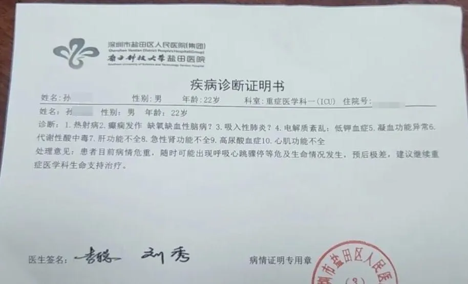 10月19日,22岁的云南人小孙到深圳“望郎归”山区徒步,由于体力不支、电解质紊乱被同行人送医,后被确诊为热射病和脑水肿。随后,小孙住进了深圳市公民 病院 重症监护室,不停处于昏迷傍边 。11月5日,孙父告诉 红星消