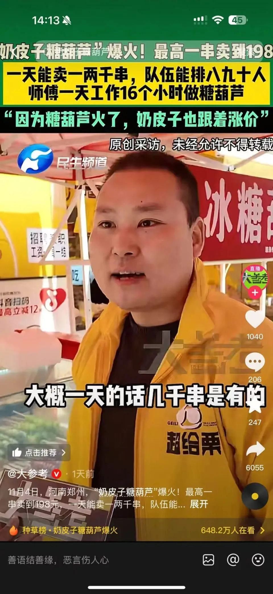 克日奶皮子糖葫芦风靡全国多地出现排队 抢购然而“第一批爱吃奶皮子糖葫芦的‘受害者’出现了这是吃成了‘糖化脸’?”11月5日相干话题冲上热搜第一据媒体报道11月4日,有网友在交际平台发帖称自己近来彻底迷上了奶皮