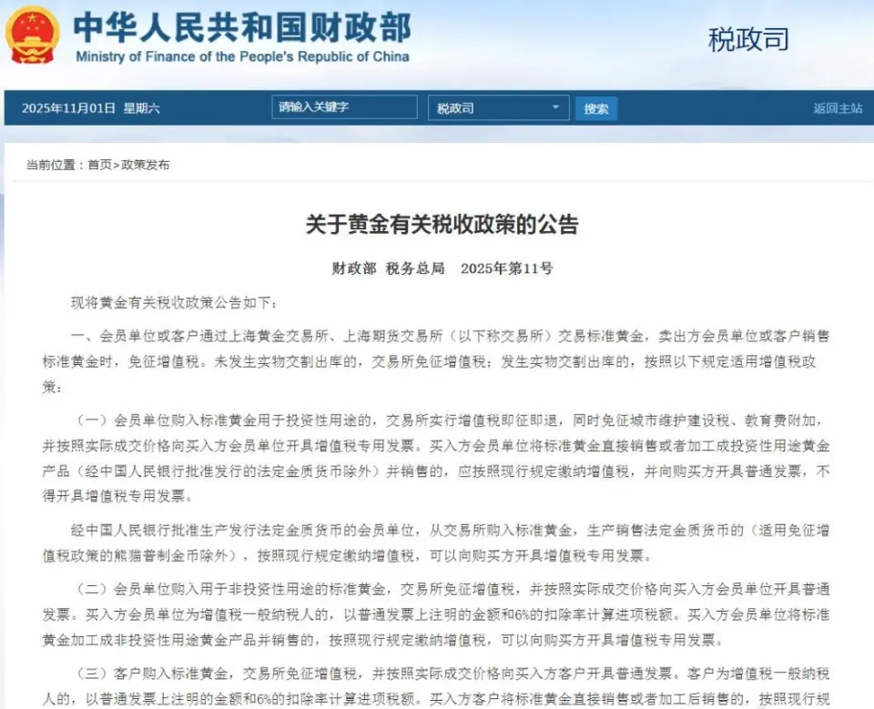![]() 金价刚经历了一场“高空跳水”,一周内从4398美元跌至3900美元以下,中国方面立马就出手 了。 两部分联合宣布 通知布告 对于什物 交割出库的黄金要征收增值税,中国的这一个做法,被不少的人看做是中美两国联手要打压黄金代价。 这场看似杂乱 的市场波动 ,背后实则是全球资本对美元信念 的寂静转移。中国为什么要在黄金波动 巨大的时间对购置 黄金征税,真是为了打压黄金代价吗?暴跌之后的黄金 黄金市场“闪崩”:避险退潮与政策误读 11月1日财务部、国家税务总局宣布 联合通知布告 :明确了黄金有关的税收政策。通知布告 内容显示: ![]()