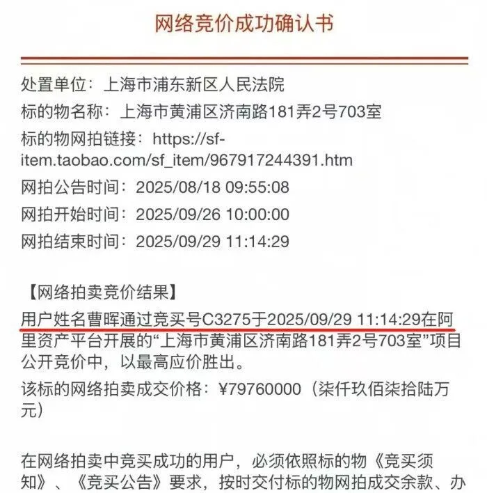 宗馥莉交班后,黯然离场;曹晖交班后,波涛不惊。 同样的出发点,不同的终点。这个10月,中国商界的两则人变乱动震动 了无数人。 2025年9月29日,上海翠湖天地五期一套法拍豪宅成交,直接炸翻了上海豪宅圈。 这套建筑面积超300平方米的大宅,在法拍场上历经四位机密买家50轮剧烈角逐,最终 以7976万元的天价落槌。 消息一出,圈内热议不停:毕竟是何方富豪,竟不惜重金拿下这套法拍房?