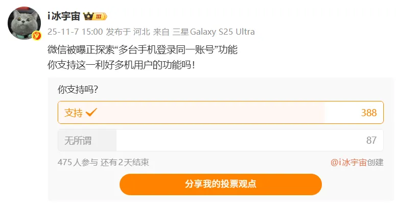 11月7日新闻 ,部门微名誉户收到了微信团队发来的调研邀请,主题是关于“多台手机登录使用统一 微旌旗灯号 ”的用户调研。 ![]() 图源:微博 依照 网友晒出的截图,调研题目还挺细,好比问你会不会在其他装备登录微信、为啥要登录、多装备登录时有哪些未便利 的地方 等等。 ![]() 图源:三言科技 小雷推测 了一下,这波操作说白了就是微信在摸索水温,看看用户对多装备兼容的需求到底有多强。究竟现在微信早就支持电脑、平板和手机同时登录了,唯独多台手机是块“禁区”,第三方多开还轻易被封号,现在主动问用户,这功效 离上线怕是不远了。 虽然现在可以用切换登录功效 添加最多5个账号,但切换起来麻烦得要逝世 ,特别是iOS用户,就算有小号能登录多台装备,也仍然接收不到另一个微信的信息。哪怕像QQ有联系关系 好友这样 的功效 ,都没有同时登录来得便利 。 新闻 一出来,网友们纷纭 玩梗,有网友开打趣说:韶光 管理大年夜 师直接上岗! ![]() 图源:微信 也有网友端庄的提意见:现在微信在手机平静板上的同时登录已经够用了,要是能优化成多装备无缝切换,那才叫真香。 ![]() 图源:微信 微信的官方调研数据还没出来,博主冰宇宙先搞了个投票,效果388票支持,87票无所谓——看来多半 人还是被多装备折腾怕了,恨不得微信赶紧解放双手。 ![]() 图源:微信 小雷觉得这投票效果一点也不意外。究竟,现在大年夜 家手里谁没个两三台装备?主力机、副机、备用机,回到家 还有平板、电脑。微信要是再逝世 守着单手机登录的规则 ,在这个万物互联的期间确切 有点落后了。 不过微信为啥忽然推测 起多手机登录了?在小雷看来,这背后可不是任意拍脑袋决定 的。起首,用户需求明摆在那里:现在许多人都有两台以上手机,工作和生活离开 用。想想看,上班用工作机回新闻 ,下班换小我 手机刷朋友圈,要是能同时登录,那体验直接起飞 。 其次,竞争敌手 像QQ、Telegram早就支持多装备同时在线了,微信要是再不改,怕是要被吐槽“老古董”了。更告急的是,互联网团体在往多装备、无缝切换的方向跑,好比云存储、跨平台同步啥的,微信作为国民APP,总不克不及 不停失踪 队吧。 固然,多手机登录听起来很爽,但题目也不少。好比隐私平安 就是个最大年夜 的麻烦。小雷看来,微信真要推这个功效 ,得先解决几个症结 点。一是平安 机制得跟上,好比逼迫二次验证、装备识别大概登录提示,别让有心人钻空子。二是用户控制官僚 加强,好比让用户本身设置哪些装备可以同时登录、哪些聊天记录同步之类的。 ![]() 图源:小雷截图 从技能角度看,这功效 实现起来应该不算太难,究竟微信配景架构早就支持多端同步了。但小雷推测,微信团队可能是在平衡便利性和风险——微信现在不但是聊天工具,还绑着付出、小步伐、"大众," 号一堆生态,万一出点岔子,那可就是场大年夜 灾难。 其实早在几年前,就有无数网友号令微信开放多手机登录,现在终于迎来了调研,剖析 微信也在谛听用户需求。究竟现在大年夜 家手里的装备越来越多,多装备协同已经成了刚需,微信作为外交刚需软件,跟上节拍 是必然的。但小雷也觉得,功效 上线前一定要多做测试,别急遽上线又因为bug下架,反而影响用户体验。 说到末了,现在就等微信的后续动作了,不知大年夜 家支持吗?评论区聊聊。 |