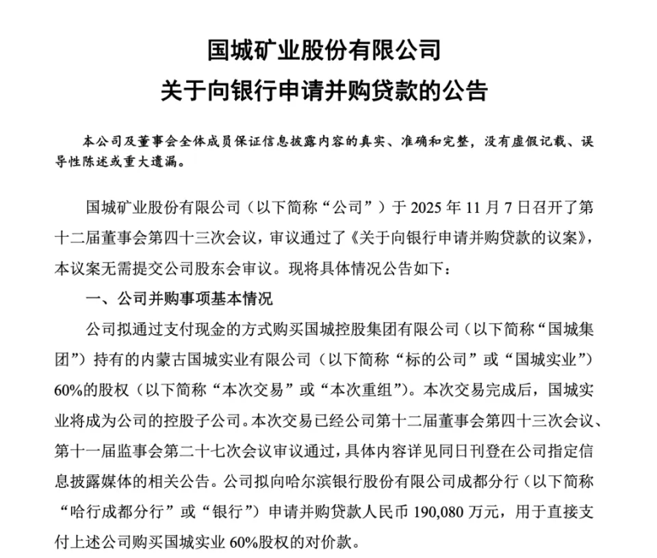 每经编辑:程鹏,向江林 国城矿业(000688)11月7日晚间公告,公司拟经由过程 付出现金方法 收购控股股东国城控股集团有限公司持有的内蒙古国城实业有限公司(下称“国城实业”)60%股权,交易金额达31.68亿元。本次交易组成 庞年夜 资产重组。 交易完成后,国城实业将成为国城矿业的控股子公司,上市公司将实现对优质钼矿资本 的战略 布局,在现有锌精矿、铅精矿、铜精矿等产物底子上,增加钼精矿采选业务 ,进步上市公司红利本事,增厚优质资本 储备,增强抗风险本事。 值得一提的是,截至2025年三季度,国城矿业货币资金为11.92亿元。