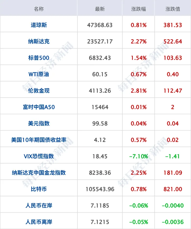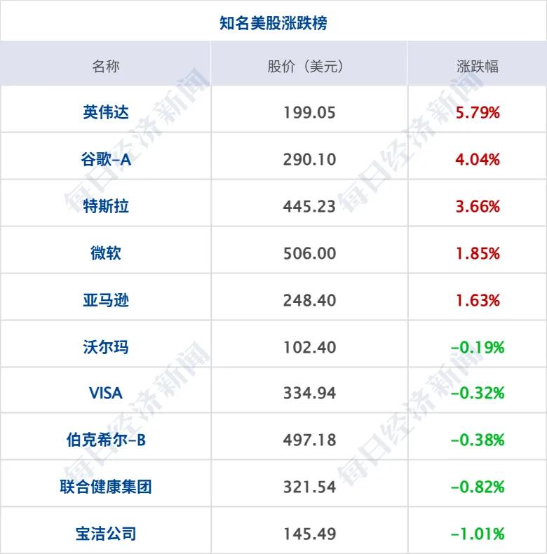 每经编纂 :王瀚黎,王晓波 1 隔夜市场 美股三年夜 指数集体收涨,道琼斯指数涨0.81%,标普500指数涨1.54%,纳斯达克综合指数涨2.27%;年夜 型科技股普涨,英伟达收涨5.8%,创4月份以来最年夜 单日涨幅,市值一夜年夜