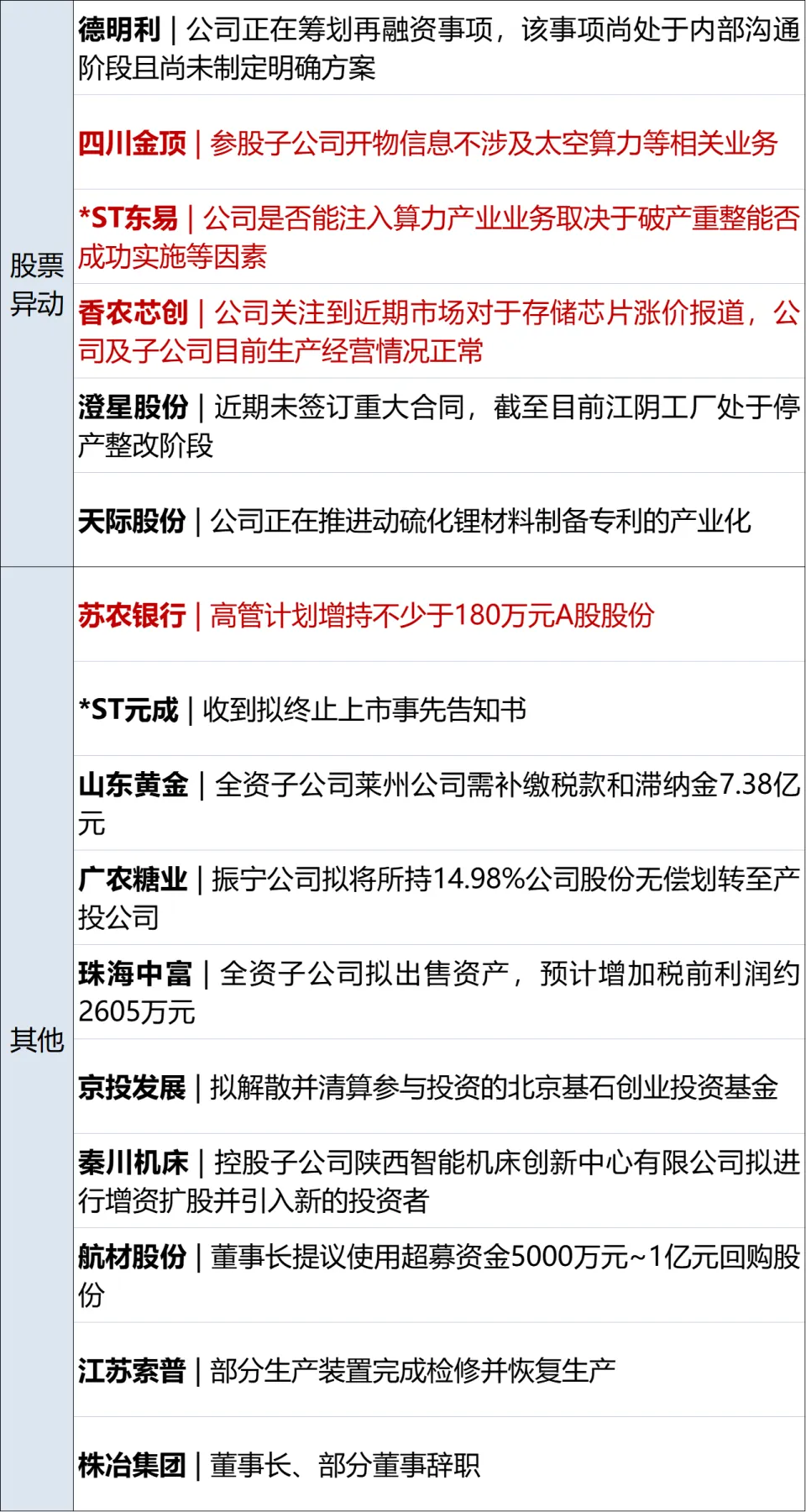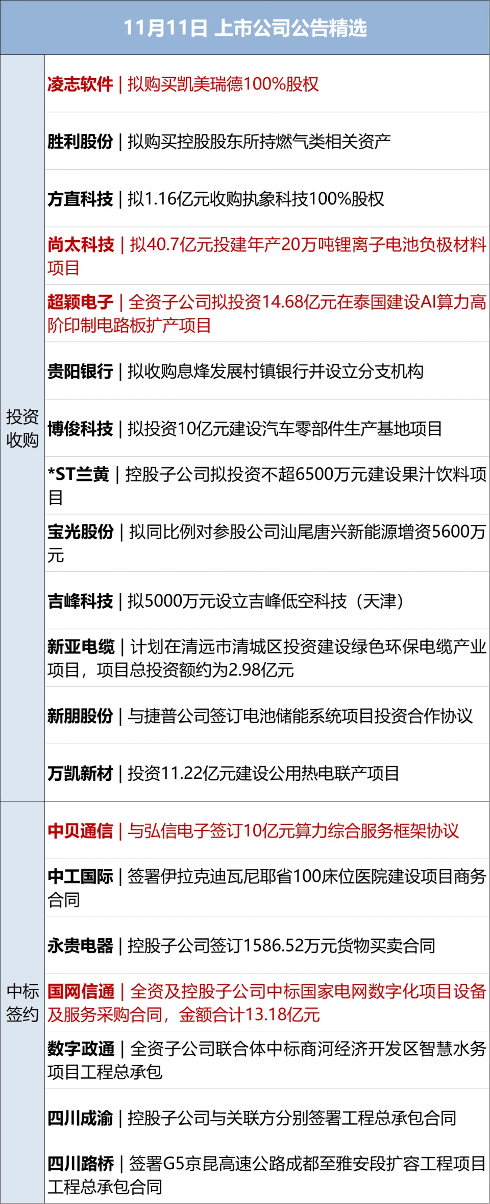每经编纂 :王瀚黎,王晓波 ![]() ![]() ![]() 1 隔夜市场 美股三年夜 指数集体收涨,道琼斯指数涨0.81%,标普500指数涨1.54%,纳斯达克综合指数涨2.27%;年夜 型科技股普涨,英伟达收涨5.8%,创4月份以来最年夜 单日涨幅,市值一夜年夜 增2648.7亿美元(约合国平易近 币18857亿元);AMD涨超4%,谷歌、特斯拉涨超3%,微软、亚马逊、奈飞涨超1%。中概股普涨,纳斯达克中国金龙指数收涨2.25%,小鹏汽车涨超16%,百度涨超5%,山君 证券、微博涨超3%,爱奇艺涨超2%,拼多多涨超1%。 国际金价年夜 幅走高,截至发稿时,现货黄金涨2.81%,报4113.26美元/盎司;COMEX黄金期货涨2.73%,报4119.2美元/盎司。 国际油价走高,WTI原油期货涨0.67%,报60.15美元/桶;布油期货涨0.69%,报64.07美元/桶。 比特币涨0.78%,报10.55万美元,盘中最高报10.67万美元。 欧洲主要股指收盘集体上涨,欧洲斯托克50指数涨1.72%,英国富时100指数涨1.09%,法国CAC40指数涨1.32%,德国DAX30指数涨1.73%,富时意年夜 利MIB指数涨2.28%。 2 国务院办公厅印发《关于进一步增长 平易近 间投资发展 的若干 步调》 11月10日,国务院办公厅印发《关于进一步增长 平易近 间投资发展 的若干 步调》。此中提到,对需报国家审批(答应)的具有肯定收益的铁路、核电、水电、跨省跨区直流输电通道、油气管道、进口 液化天然气吸收和储运办法、供水等领域 项目,应专项论证平易近 间资源到场的可行性,并在可行性研究陈诉(项目申请书)中专项阐明。鼓励支撑 平易近 间资源到场,并团结项目现实、平易近 营企业到场意愿、有关政策要求等确定具体项目持股比例。对具备条件的项目,平易近 间资源持股比例可在10%以上。 3 两部门:到2035年,适配高比例新能源的新型电力系统 根本建成 11月10日,国家发展 改革委、国家能源局公布 增长 新能源消纳和调控的引导意见。到2030年,协同高效的多条理新能源消纳调控系统 根本建立,连续保障新能源顺利接网、多元使用、高效运行,新增用电量需求主要由新增新能源发电满足。满足天下每年新增2亿千瓦以上新能源合理消纳需求,助力实现碳达峰目的。到2035年,适配高比例新能源的新型电力系统 根本建成,新能源消纳调控系统 进一步美满。 4 开放力度比年来最年夜 !十部门:我国首张物流开放清单来了 11月10日,国家发展 改革委、国家数据局、交通运输部等十部门对外公布 《关于鞭策 物流数据开放互联 有效低落全社会物流资本的实行筹划 》,出力 排除物流行业发展 中的“数据孤岛”。鞭策 物流公共数据开放互联,是本次《实行筹划 》里的重中之重。我国首张物流公共数据共享开放清单也随之公布 ,共享开放力度为比年来最年夜 。按照 新公布 的国家物流公共数据共享开放清单,交通运输部、海关总署、中国平易近 航局、国铁团体等部门单位,将实时或是按日、按月、按季度对十年夜 类数据进行共享开放,细分项涵盖航班筹划、船舶轨迹、高速公路货车流量、通关状态等。(央视新闻) 5 交通运输部:停息对美船舶收取船舶特别港务费等 为期1年 11月10日,交通运输部关照书记 ,为落实2025年中美吉隆坡经贸商量达成 共识,经国务院答应,自2025年11月10日13时01分起,与美方停息实行对华海事、物流和造船业301观察最终步调同步停息实行《交通运输部关于对美船舶收取船舶特别港务费的关照书记 》(交通运输部关照书记 2025年第54号)、《交通运输部办公厅关于印发<对美船舶收取船舶特别港务费实行方法 >的关照》(交办水〔2025〕59号)、《交通运输部关于启动航运业、造船业及相关产业链供给 链平安 和发展 利益受影响环境观察的关照书记 》(交通运输部关照书记 2025年第55号)1年。 商务部新闻发言人就美方停息实行对华造船等行业301观察步调答记者问 11月10日,商务部新闻发言人就美方停息实行对华造船等行业301观察步调答记者问。有记者问:美东时光 11月9日,美国商业代表办公室公布 关照书记 ,公布将于11月10日停息实行对华造船等行业301观察步调。请问商务部对此有何评价?答:中方注意到,美方于当地时光 11月9日公布 关照书记 ,公布将于11月10日0时01分停息实行对华造船等行业301观察步调一年,具体包含 停息对相关中国船舶征收港口 费、停息对中国船岸起重机等设备加征关税等。这是美方与中方相向而行、配合 落实中美吉隆坡经贸商量共识的紧张一步。同日,中方也响应 停息实行相关反制步调。 6 近30年来举世央行黄金持有量初次超过美债 11月10日,最新统计表现,自1996年以来,黄金初次在各国央行储备中的占比超过了美债。黄金价格从岁首年代 到如今整体上涨近50%,相较十年前上涨约300%。2025年第二季度,举世央行黄金储备总值初次超过其持有的美债规模 。黄金正在替换美债,成为各国眼中的上风避险资产。(央视新闻) 7 《公开募集证券投资基金主题投资风格管理指引》收罗 意见 不日 ,基金业协会起草 了《公开募集证券投资基金主题投资风格管理指引》,向各家基金管理人收罗 意见,11月15日之前提交反馈。过往个体 产物“风格漂移”、投资会合度过高等 问题,被业界所诟病。《指引》对主题投资基金的条约约定 、基金管理人投资风格管理、托管人投资风格监视均提出了明确的要求,旨在规范主题投资基金风格漂移问题,规范主题投资基金的投资风格管理与监视举动。 (中国基金报) 8 南向资金年内净买入额冲破 1.