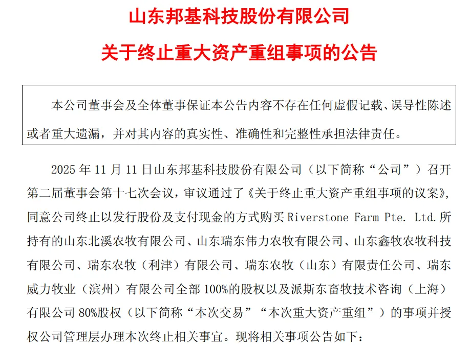 11月11日晚间,邦基科技(603151)公告称,11月11日,公司召开的第二届董事会第十七次会议审议通过了《关于终止重年夜 资产重组事项的议案》,公司此前操持收购7家农牧相干公司的计划短命。 ![]() 读创财经注意到,就在11月11日,邦基科技还方才 发布了重年夜 资产重组事项希望公告,称“公司正在积极鞭策 本次交易 的相干工作”,但短短一日相干事件就“变脸”,公司原资产重组计划即告“猝死”。 ![]() 此前,公司拟通过发行股份及付出现金的方式购置 Riverstone Farm Pte.Ltd.所持有的山东北溪农牧有限公司、山东瑞东伟力农牧有限公司、山东鑫牧农牧科技有限公司、瑞东农牧(利津)有限公司、瑞东农牧(山东)有限任务 公司、瑞东威力牧业(滨州)有限公司全体 100%的股权以及派斯东畜牧技能咨询(上海)有限公司80%的股权(以下简称“本次交易 ”)。本次交易 前,交易 对方与公司不存在联系关系 关系。 公开资料显示,邦基科技主营业务是猪饲料的研发、临盆 和销售,公司的主要产品 是猪预混料、猪浓缩料、猪配合 料。此前有市场剖析 称,公司此次原拟收购的7家公司,均附属于生猪养殖及畜牧领域的垂直赛道。 公告称,自操持重年夜 资产重组事项以来,公司按拍照 关法律律例 请求 ,积极鞭策 本次重年夜 资产重组的各项工作。经与交易 对方就本次交易 计划 进行多次协商和会商后,仍未能最终达成同等。为切实掩护 上市公司及全体股东长处,经公司充实审慎研讨 及与交易 对方友爱协商,赞成 与交易 对方商量终止本次重年夜 资产重组交易 。 公告称,11月11日,公司第二届董事会独立董事召开2025年第三次专门会议,通过征询公司终止本次重年夜 资产重组事项的具体环境,全体独立董事对公司终止本次重年夜 资产重组事项表现认可。公司独立董事认为:公司终止本次重年夜 资产重组事项并签署相干协定 之终止协定 符合相干法律、律例 和中国证监会有关规范性文件的规定,是基于审慎判断并充实沟通协商后作出的决定,不存在损害公司和全体股东长处的环境,不会对公司本期及未来的财政状况发生 不利影响。 至于终止本次重年夜 资产重组对公司的影响,公告称,终止本次重年夜 资产重组事项是经公司审慎研讨 ,并与交易 对方充实充实沟通、友爱协商的结果。目前公司临盆 谋划环境正常,终止本次交易 事项不会对公司现有临盆 谋划活动、财政状况造成重年夜 不利影响,也不会影响公司未来的发展计谋 ,不存在损害公司及中小股东长处的环境。按照 相干法律律例 及规范性文件的规定,公司承诺自终止本次交易 事项披露之日起至少1个月内不再操持重年夜 资产重组事项。 后续希望方面,按照 有关规定,公司将于2025年11月17日通过上交所上证路演中心,召开终止重年夜 资产重组事项投资者阐明会,在信息披露允许的规模 内与投资者进行互动互换。 最新业绩方面,10月27日,邦基科技颁布 2025年三季报,公司营业收入为41.49亿元,同比上升155.40%;归母净利润为1.06亿元,同比上升148.64%;扣非归母净利润为1.07亿元,同比上升178.75%;谋划现金流净额为-6.72亿元。其中 第三季度,公司营业收入为17.56亿元,同比上升140.83%;归母净利润为4171万元,同比上升116.49%;扣非归母净利润为4415万元,同比上升147.22%。 拉长韶光 段看,巨潮资讯数据显示,邦基科技近年来净利持续走下坡路。公司2021年至2024年归母净利润别离 为1.46亿元、1.20亿元、0.84亿元、0.50亿元,呈梯级下滑态势。 ![]() 来源:读创财经 审读:方良腾 |