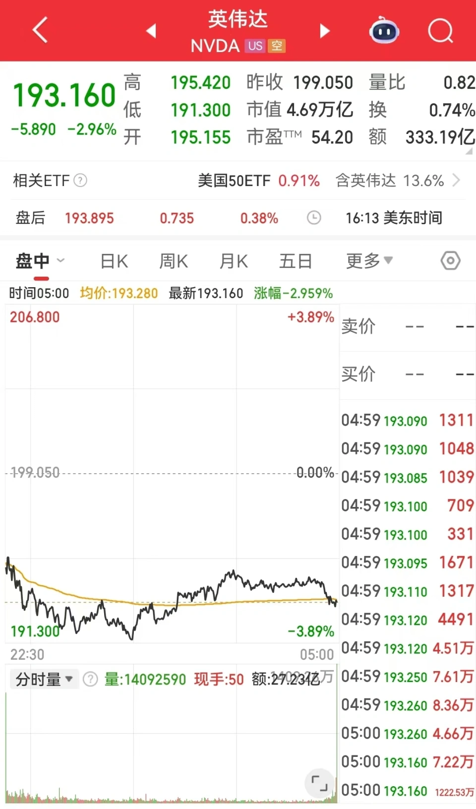 芯片股普跌,美光科技跌超4%,ARM跌超3%,英伟达、AMD、应用材料跌超2%。大型科技股涨跌互现,苹果涨超2%,奈飞涨超1%,甲骨文跌超2%,特斯拉跌超1%。 此中,英伟达市值一夜蒸发1431.27亿美元(约合公民 币10186.78亿元)。