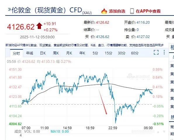 富时A50期指连续夜盘收涨0.07%,报15354点。 国际油价11月11日上涨。截至当天收盘,纽约商品买卖业务 所12月交货的轻质原油期货价格上涨91美分,收于每桶61.04美元,涨幅为1.51%;1月交货的伦敦布伦特原油期货价格上涨1.10美元,收于每桶65.16美元,涨幅为1.72%。 现货黄金盘中一度跌穿4100美元关口。
