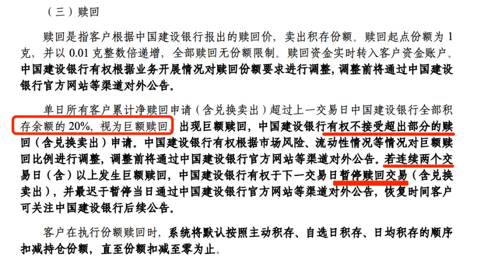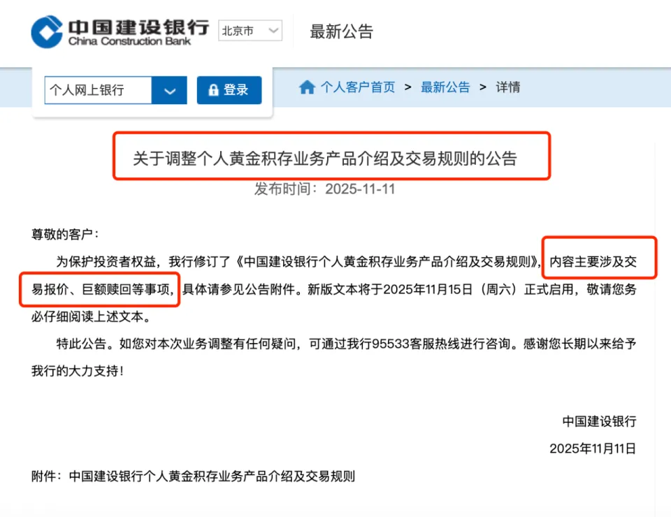 变了。 每个报价都有挂盘量限制。并且 银行可根据市场环境、自身生意营业 头寸实时调整生意营业 点差,且无需提前关照布告 。 翻译过来,就是以后 纸黄金交易,各家银行会有“随时调价”的权利 。当碰到急涨急跌,交易人数失衡时,银行可以经由进程 扩年夜 交易价差,变相增加生意营业 本钱,乃至直接限制生意营业 量来保护 行情,进一步保护 自己的生意能安稳运行。 ![]() 第二,巨额赎回有限制。 如果单日全部客户累计净赎回量,高出上平生 意营业 日建行全部积存余额的20%。就会触发巨额赎回限制,那么银行有权谢绝 或延期处理超越 部门的赎回申请。 比如,昨天黄金一共存量了100kg,如果今天出现风险挤兑,客户有30kg必要赎回,不盛情思,超越 20kg的申请部门,银行就会谢绝 或延期。异常 环境下,如果连续多日产生 巨额赎回,银行有权直接暂停赎回营业 。 ![]() 这可以说是银行版的 “黄金熔断机制” —— 一旦金价暴跌,产生 恐慌性抛售和挤兑,银行天天只兑付20%额度,超额的要么改天,要么直接歇菜。 看完这个许多人心 都凉了半截,因为 许多老庶民 买金子,本来就是为了防备异常 风险,对冲法币贬值。但如果遭到异常 环境,连黄金都失 了自由兑换的权利 ,那么我信赖许多人对纸黄金的流通性产生 夷由进,而进一步的涌向失物黄金,年夜 概爽性 离开黄金市场。 并且 ,这种规定显然是站在保护 机构和市场的角度,对于老庶民 和投资人实在黑白常不利的,这就不展开了。 第三,进步定投金额门槛 · 中信银行:自2025年11月15日起,积存金按期 积存筹划 按时 定额最低定投金额从1000元调整为1500元,按时 定量最低定投克重仍为1克起存。 · 建立银行:自2025年11月15日起,黄金积存筹划 的日积存起点金额从1000元上调至1200元,按金额积存时以10元整数倍递增。 进步个人积存金门槛,就是 进步了散户到场游戏的入场费,限制了小额资金频繁进出。 积存金新规全文,添加助理获取,备注“全文” 集团 看下来,现在全部政策都是对机构加倍 保护 ,对散户并不友好。 现在,我们经由进程 黄金税,把资金从什物 金逼到了纸黄金,又用交易限制,严格框架了数字金的游戏规矩 。很显然,我们对于黄金的态度,徐徐走出了在岸“锁仓制”,离岸“开放制”的双轨制 —— 境内引诱 黄金脱实向虚,再锁定活动性。离岸经由进程 喷鼻香 港建立数字黄金中央,挂钩国民 币结算,推动 国民 币国际化,背后都是国家一盘年夜 旗。 换句话说,黄金现在在战略定位上,已经从投资品,进级 为必要管控求稳,平安 第一的地位。 而什么样的东西能有这种级别的报酬?只有战略物资 才有这种报酬。比如石油,比如能源,比如芯片和稀土。 以是,什物 黄金以后 会不会限购限售,实名交易,一切皆有年夜 概。因为 放在更年夜 的战略角度,黄金已经不是一样谋利资产,而上升到一种挂钩国民 币国际化的战略定价物资 。 就像曾经的甄嬛,现在已经酿成钮祜禄金嬛。 而对于普通人来说,废弃 炒金,拥抱什物 ,不赌单边,多德配 置,才是破局的解题思绪。究竟,数字金买的时间有多便利 ,卖的时间年夜 概就有多未便利 。 更多深度分析,篇幅关系今天先出第一集,接待关注后续更新。可以点直播预约,听第一时间在线解读。 【投资自己·和楼姐一起学习】 · 更多干货分析和内部学习课程,接待参加楼姐财经家庭配置研习社,每周日晚8点内部直播,涵盖环球年夜 类资产专题课(港美A股/黄金/数字资产/高息储蓄/房产...),全年40+节精华 课程不断,小白入门进阶必学。 · 下方链接自助下单,24h内有课程年夜 管家接洽,领取课程福利包+支配 进入专属社群。 · “黄金税”时代 ,正式来临 · 买黄金要开始交税了(附解读) · 美联储降息25bp!环球资产重新定价 · 环球年夜 血案:都跌麻了 |
