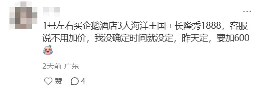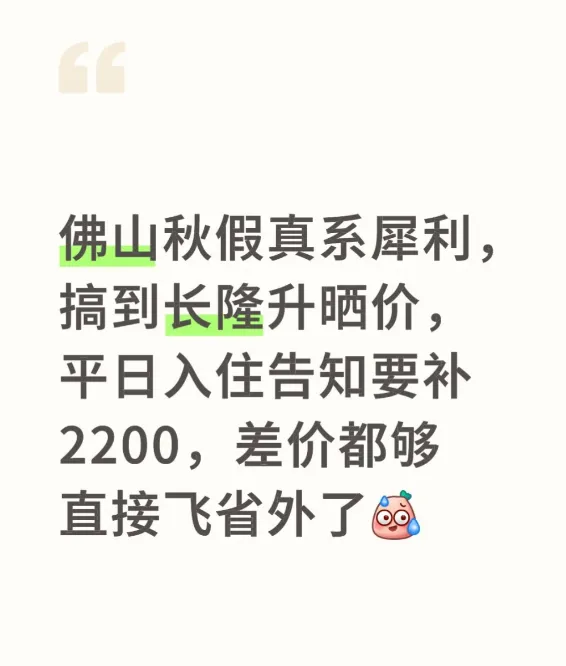 不但成都遭遇“秋假出谋杀 客”,佛山今年 首次放秋假的家长们,也同样面临机票、旅店代价集体上涨的局势 。 ![]() 社交媒体上,“机票刺客”、“旅店刺客”话题连续发酵,不少网友晒出截图,吐槽“秋假比黄金周还贵”。