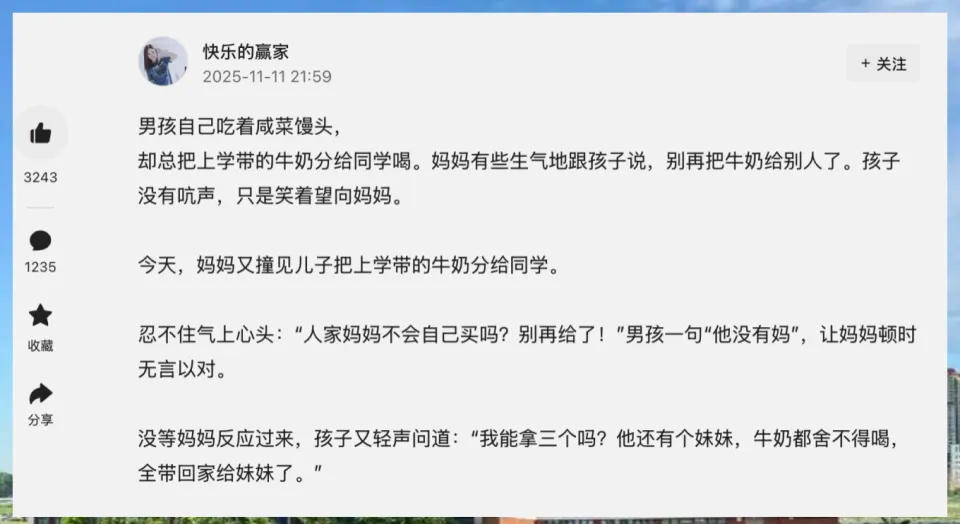 近日,发生在河南商丘的一件小事,轻轻叩击了无数人的心。小男孩自己就着咸菜啃馒头,却总把从家里带来的牛奶分给同砚。妈妈再次发现后,发火了:不要再把牛奶分给别人了,他没有妈妈吗?小男孩轻声说“他没有妈!”