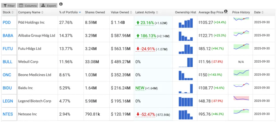 【环球网财经综合报道】随着美股机构投资者2025年第三季度持仓数据(13F)连续披露,高瓴、景林、高毅、东方港湾等中资私募机构的海外投资动向浮出水面。 高瓴旗下专注于二级市场投资的基金管理平台HHLR Advisors宣布 了停止2025年三季度末的美股持仓陈诉。数据表现,停止三季度末,HHLR Advisors共持有33只美股,持仓总市值达41亿美元,较二季度增加 9.9亿美元,增幅为32%。 ![]() (HHLR Advisors持仓情况) 在持仓调整方面,HHLR Advisors三季度大肆加仓拼多多、阿里巴巴等中概股,新进百度集团、满帮集团等公司,同时减持富途控股、网易、逸仙电商等,清仓京东、唯品会、理想汽车等标的。今年三季度末,该机构持有的中概股市值占其总持仓市值的比例超过90%,表现出对中国优质资产的长期看好。 详细来看,HHLR Advisors三季度新买入5只股票,增持4只股票,清仓8只股票,减持4只股票。其前十大重仓股包括拼多多、阿里巴巴、富途控股、微牛证券、百济神州、百度集团、传奇生物、网易、贝壳等。 高毅资产停止三季度末美股持仓升至5.8亿美元,较二季度增加 46%。其买入28万股谷歌母公司Alphabet股票,鞭策 后者升至第三大持仓;同时加仓贝壳、网易、爱奇艺等中概股,并减持百胜中国、亚玛芬体育等消耗类股票。华住与拼多多仍为其最大两个持仓股,合计占比超60%。 景林资产同期美股持仓增至44.4亿美元,较二季度增加 54%。该机构同样增持Alphabet,表现对人工智能领域 的持续看好;同时买入英伟达、新思科技,并在旅店与电商赛道加码——亚朵新增持股超208万股成为第二大增持标的,叠加对华住的增持,对中国连锁旅店举行体系性结构。其余 ,景林大幅增持阿里巴巴(年内股价飙升94%)和拼多多,清仓大全新能源、携程、百济神州及禾赛科技,并新建仓主动驾驶企业文远知行(持股268万股),后者正加速技能商业化落地。 但斌执掌的东方港湾海外基金三季度市值从11.3亿美元增至12.9亿美元,持仓标的从13只增至17只。该基金首次建仓22.1万股阿里巴巴(占比3.06%,进入前十大重仓),但斌此前曾公开表现看好中国互联网公司代价重估空间。与此同时,其减持网飞、亚马逊、Meta、微软等科技股,亚马逊和网飞因大幅减持退出前十大重仓行列。 |