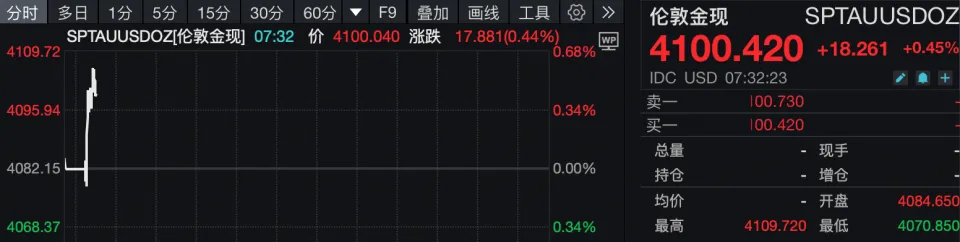 在上周五年夜 跌之后,周一(11月17日)盘初,贵金属代价企稳回升,美股指数期货低开高走,加密货币市场暴跌。黄金、白银开盘后直线拉升。国际现货黄金从新 站上4100美元关口 ,最新报4100.420美元/盎司,涨幅为0.45%;