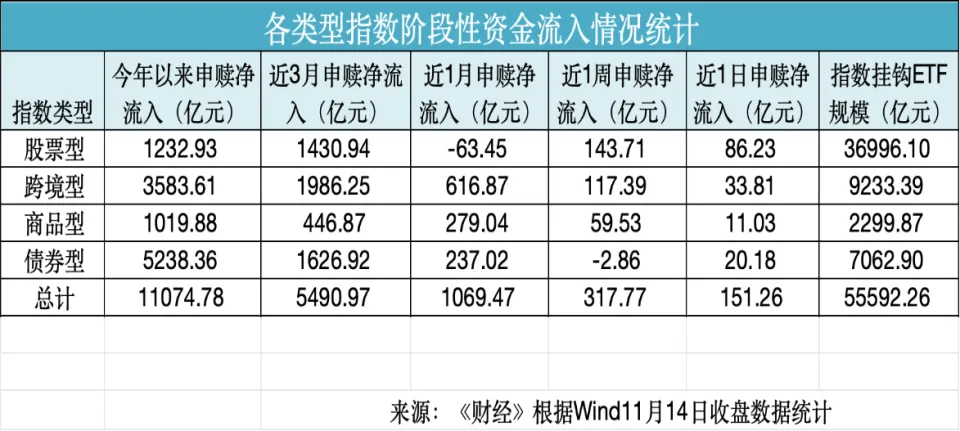 队曾对 A 股宽基指数进行增持,剔除该部门资金后,A 股股票型指数今年以来现实呈净流出态势;商品型指数中,SGE黄金9999今年净流入888亿元,占领