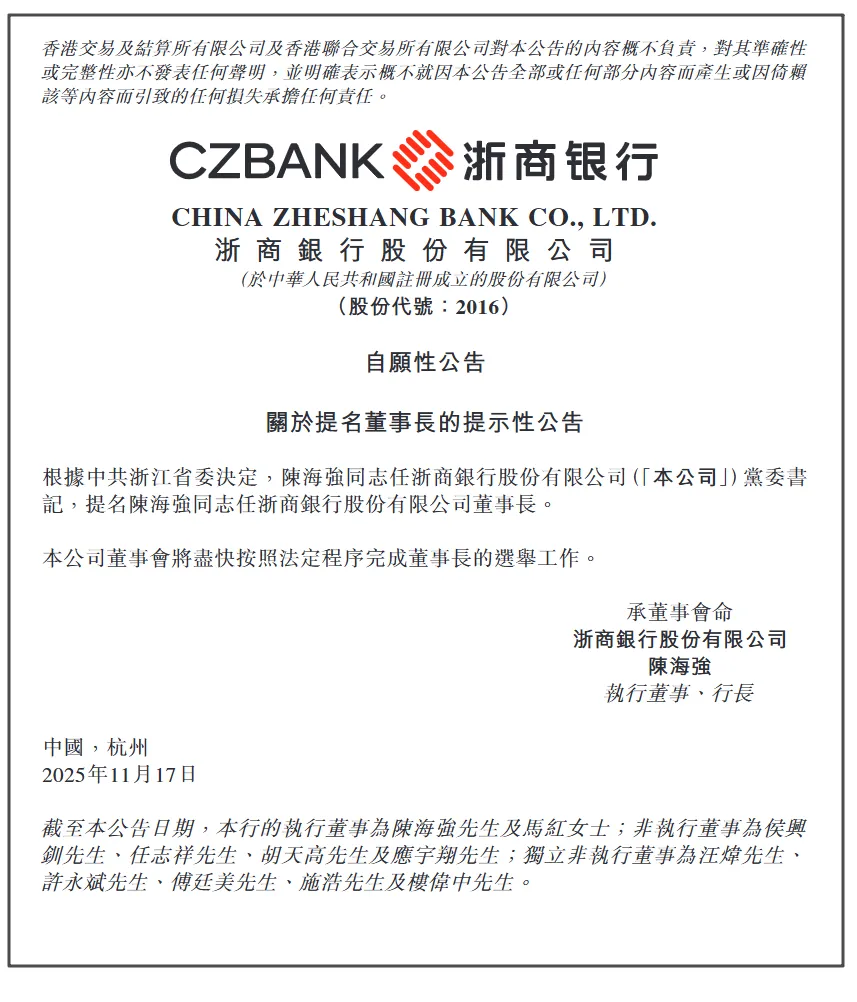 浙商银行11月17日宣布 关照书记 :按照 中共浙江省委决定,陈海强同志任浙商银行股份有限公司党委书记,提名陈海强同志任浙商银行股份有限公司董事长。本公司董事会将尽快按照法定步伐完成董事长的推举工作。