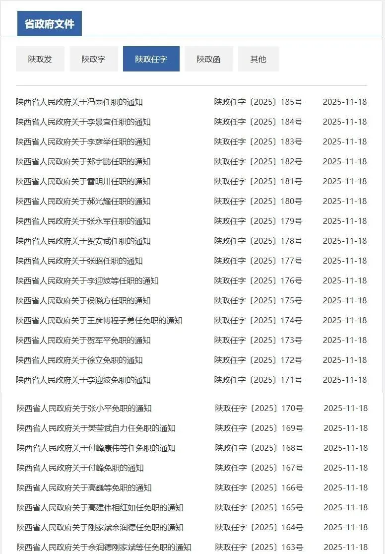 本日(11月18日) 陕西省当局公布 最新任免职通知↓ 11月18日,陕西省人民当局网站公布 任免通知。 陕西演艺团体有限公司: 省当局2025年11月11日决议 ,任命余润德为陕西演艺团体有限公司董事长。 赞成 : 眭俊为陕西