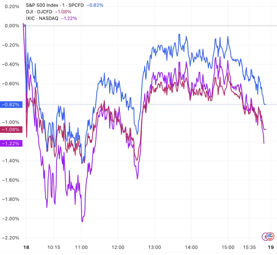 财联社11月19日讯(编辑 夏军雄)美东时光 周二,投资者对科技股估值过高的担忧情绪继承发酵,三大指数集体收跌,纳指和道指跌幅均凌驾1%。(三大指数日内走势图,来源 :TradingView)停止收盘,道琼斯指数跌1.07%,