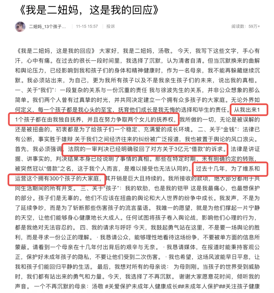 被前女友曝料有300个娃,曾自称“中国首父”、发愤要生50个孩子? 近日,关于游戏圈大佬徐波的瓜震动了众多网友。 他初中辍学,24 岁加盟网易,打造出 80 后的集体回想《梦幻西游》,2006 年开办多益网络 ,如今身价达 230 亿。 但他公开颁发 的痛恨女权、划定 公司员工授室彩礼不得凌驾10万等谈吐 ,也让他长期处于舆论旋涡。 ![]() 去年,游戏圈大佬徐波声称被前女友“二妞妈”卷走3亿多元,他以“民间借贷轇轕 ”为由将其诉至法院。 近日,此事件有了最新渴望。 ![]() 11月15日,自称徐波前女友的“二妞妈”(汤某),在微博发文陈诉了她与徐波之间的情感关系、款子往来以及抚养孩子的情况。 对于这场款子轇轕 ,汤某表现法院一审判决已明确驳回了徐波关于3亿元“借钱 ”的诉求。 ![]() 其余 ,文中还曝出一个猛料:徐波疑似有300个孩子。 她表现:“已往十几年,为了维系和运营这个拥有300个孩子的各人庭,其开销是巨大 且一连的,我所吸收的款子,绝大部分都用于配合 生存期间 的全部开支。” 对于“300个孩子”的说法,有网友质疑是不是多写了个零,汤某回复“没有,只会少写不会多写”。 ![]() 而且,她提到的这300个孩子好像没有户口。 ![]() 汤某还夸张 ,自己独自抚养着与徐波相干的11个孩子,并正在夺取两个女儿的抚养权。 18日,汤某再次发文,曝料徐波代孕生子、荼毒孩子。 她表现,这些孩子“应当 有自由,应当 有属于自己的成长 空间,而不是被一个精神扭曲的人看成一场实验的‘小白鼠’,更不应当 被看成‘养蛊’一样的优越 劣汰。”