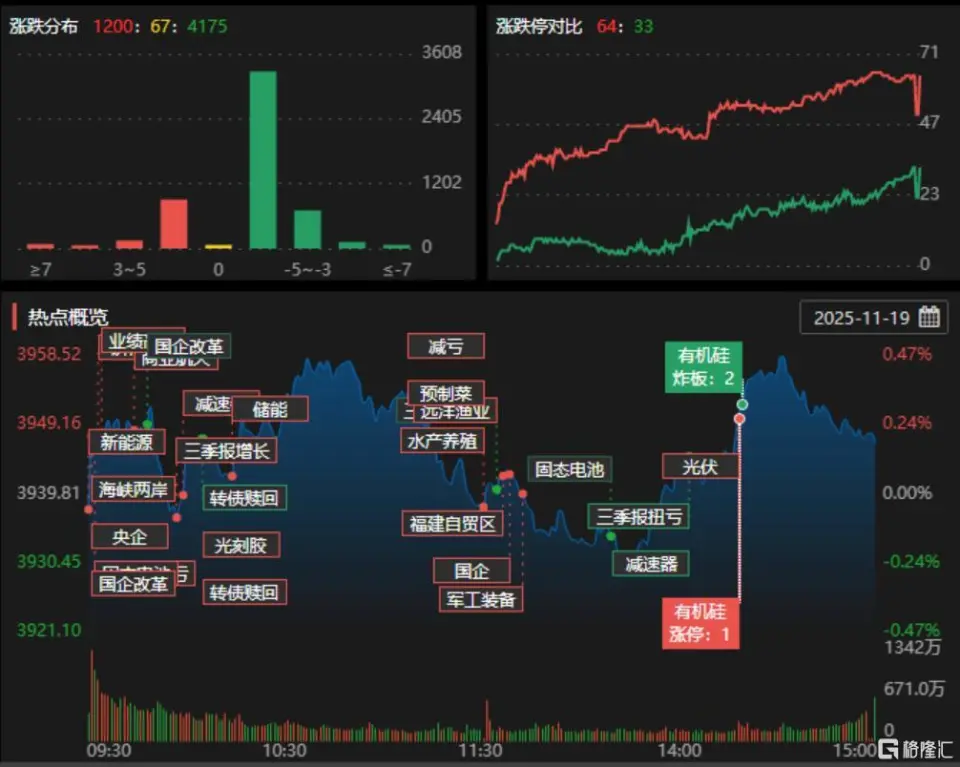 11月19日,A股三大年夜 指数小幅震荡,沪指、创业板指均收红。停止收盘,沪指涨0.18%报3946点,深证成指平收,创业板指涨0.25%。全市场成交额1.74万亿元,近4200股下跌。盘面上,军工、船舶制造 板块爆发,江龙船艇、