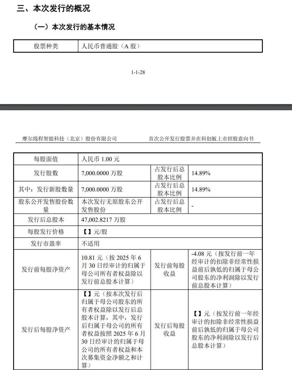 财联社11月20日讯,摩尔线程IPO迎来新盼望。 本日晚间,摩尔线程在上交所宣布 通知书记 称,本次刊行 股份数量为7000万股,全部为公开发行新股。刊行 代价为114.28元/股,预计募集资金总额为80亿元,扣除刊行 费用后,预计募集资金净额为75.76亿元。 按照 通知书记 ,该股将在2025年11月24日(T日)进行网上和网下申购。 ![]() 按照 此前招股仿单 表现,摩尔线程本次刊行 后总股本4.7亿股,按本次刊行 价盘算,该股上市时总市值将达537.15亿元。 ![]() 据招股仿单 ,公司本次刊行 募集资金将用于摩尔线程新一代自立 可控 AI 训推一体芯片研发项目、摩尔线程新一代自立 可控图形芯片研发项目、摩尔线程新一代自立 可控AI SoC 芯片研发项目及增补活动资金。 |