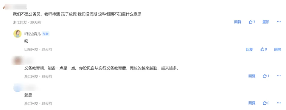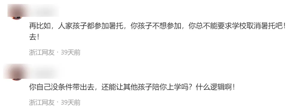 另有网友认为 ,放春秋假就是为了解放孩子,总不能 因为你没前提 带出去,让其他孩子都陪着你一起上学吧?就算真的没方法 带娃,学校另有免费托管,怕什么? 确切 ,这样不成 ,还可以那样,都是在摸索 中。