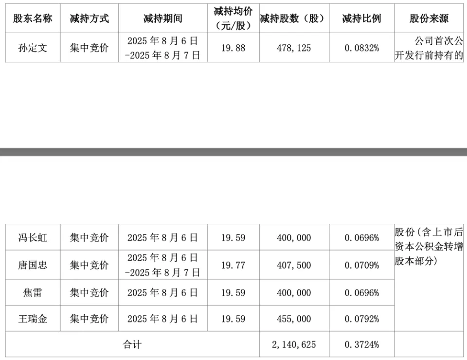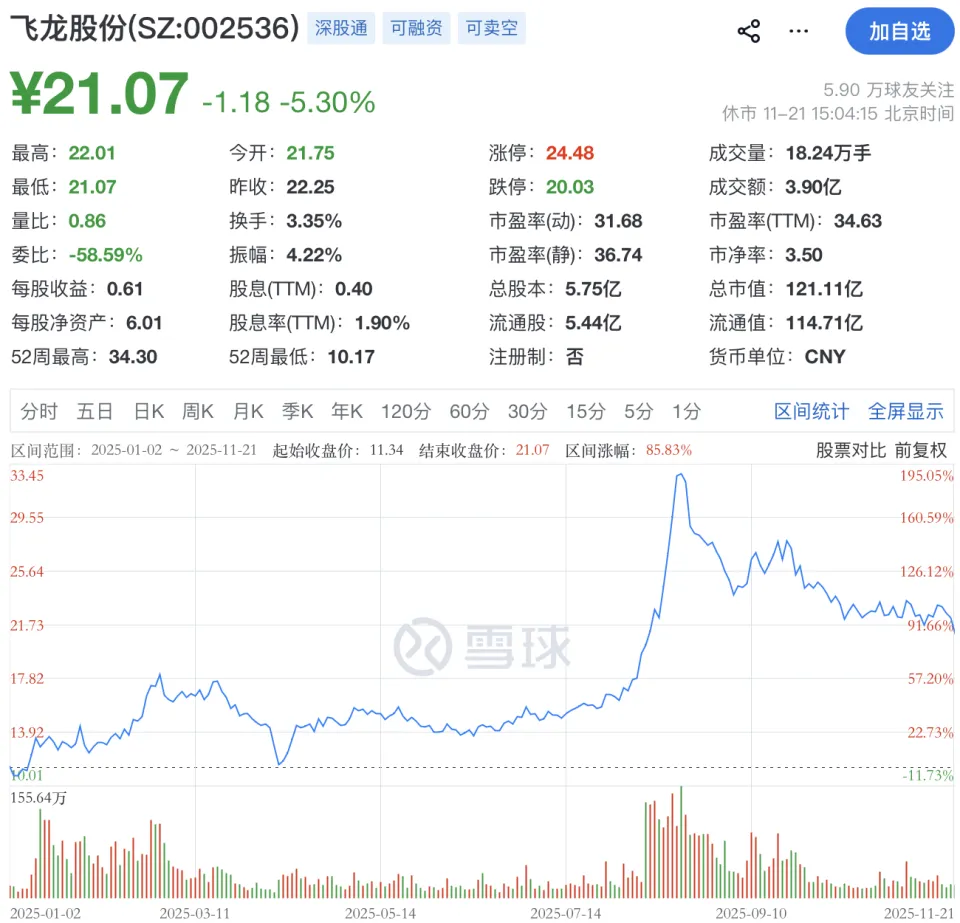11月21日,飞龙股份(002536)通知布告 ,公司控股股东河南省宛西控股股份有限公司(以下简称“宛西控股”)计划自通知布告 之日起十五个生意业务日后的三个月内,以年夜 批 生意业务方法 减持公司股份不超过11,495,700股(减持比例不超过公司总股本的2.0000%)。 通知布告 表现,宛西控股为公司控股股东。截至通知布告 披露日,持有公司股份187,975,771股,占公司总股本比例32.7036%。 减持缘故原由为自身资金需求,股份来源为公司初次公开发行股票上市前宛西控股持有的股份。 这并非宛西控股近期初次减持。回溯本年8月,其方才 完成上一轮减持计划。 8月9日,飞龙股份宣布 通知布告 ,宛西控股于2025年8月5日至2025年8月8日通过会合竞价方法 合计减持公司股份5,632,461股,占总股本比例0.98%。截至本通知布告 披露日,本次股份减持计划已实施完毕。 ![]() 除了控股股东,公司高管层也在同期出现了减持动作。 8月8日,飞龙股份宣布 通知布告 ,公司于克日收到副总司理、财政总监孙定文,副总司理冯长虹、唐国忠、焦雷、王瑞金分别出具的《关于股份减持计划实施完毕的告诉 函》,获悉上述人员通过会合竞价方法 合计减持公司股份2,140,625股,占总股本比例0.3724%,本次股份减持计划已实施完毕。 ![]() 值得留意的是,在该减持通知布告 刚开端 披露之际就有投资者在互动平台提问称,虽然 5名高管减持数量不年夜 ,但对市场却形成较年夜 打击 ,因为5名公司高管在同一韶光 ,因同一个情由 “小我 资金需求”宣布 拟减持通知布告 ,如此同等行动减持是否过于巧合? 飞龙股份对此表示,公司董监高前次减持股份照旧十年以前。本次同一时代 拟减持具有偶发性,且金额较小,主如果 其小我 资金必要,对市场影响较小。 资料表现,飞龙汽车部件股份有限公司的主营业务是汽车领域热解决 部件和平易 近 用领域热解决 部件的制造、贩卖。 业绩方面,2025年前三季度,公司实现营业总收入32.37亿元,同比降落7.38%;归母净利润2.87亿元,同比增长7.54%;扣非净利润3.04亿元,同比增长16.66%。 二级市场上,截至11月21日收盘,飞龙股份下跌5.30%报21.07元/股,总市值121.11亿元。本年以来,公司股价已上涨85.83%。 ![]() 来源:读创财经 |