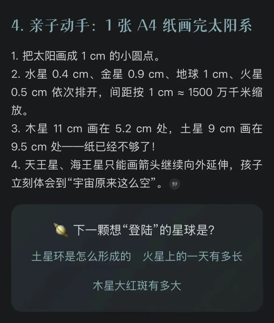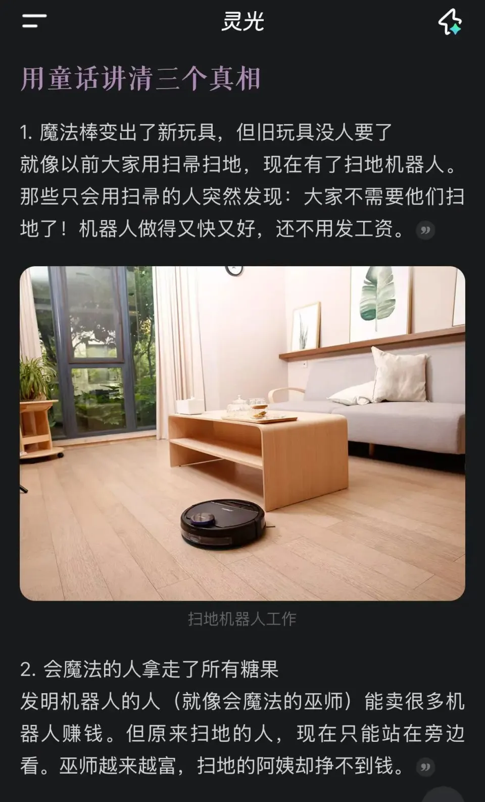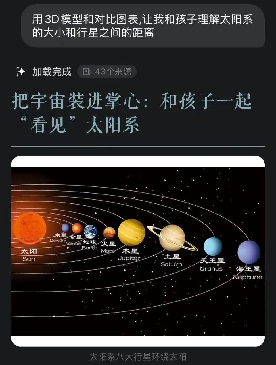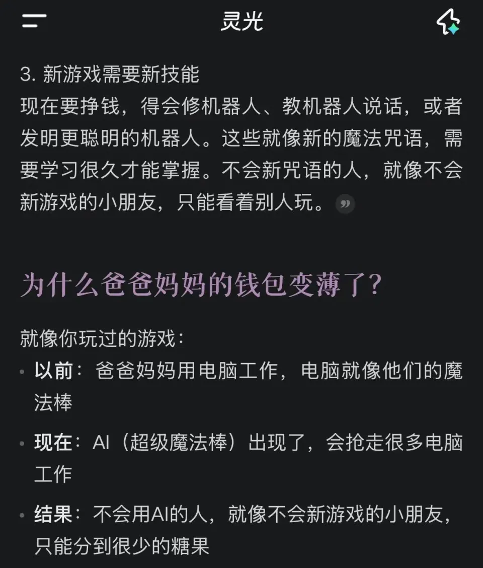 我和弟弟立刻就在客堂里搭起了"黑洞实验室"。他拿动手电筒往毛毯帐篷里照,发明 光真的"消散"了(其实是被毛毯吸收了),高兴得手舞足蹈:"妈妈,我做出黑洞啦!" 灵光还天生了一个"黑洞吞噬光束"的互动小游戏界面,屏幕上的光束一点点被黑洞吸进去,弟弟看着那个 动画演示,终于明白了"连光都逃不出来"是什么意思。 末了,灵光还来了一句超等温馨的总结: ✨ "其实每个宝宝心里都住着一个小黑洞,专门吃掉爸爸妈妈的亲亲~ 💕" 然后它问:"想不想看黑洞是怎么'打嗝'的?" 弟弟立刻喊:"想!" 我看着这个布满童趣的科普内容,心里感叹:这才是真正的寓教于乐啊。 第二天,弟弟又问:"恐龙为什么会灭绝啊?" 我又打开灵光,输入:"为什么恐龙会灭绝?用3D动画和地图 展示小行星撞击的过程。" ![]() 后来,为了满足他对宇宙的好奇,我还问了太阳系的问题。 我输入:"用3D模型 和对比图表,让我和孩子明白太阳系的巨细和行星之间的间隔"。 ![]() ![]() 既然天上的聊完了,地上的也不克不及 少。 针对地剃头蒙,我输入了:"用交互地图 和幽默 的图标,给孩子介绍 中国34个省级行政区的地位 和特点 "。 灵光天生了一个交互地图 ,每个省份都配了特点 图标,比如四川就是熊猫。弟弟看着地图 ,高兴地指着熊猫说:"妈妈,我要去这里看年夜 熊猫!" ![]() 除了陪弟弟科普,面临11岁姐姐的"硬核"提问,灵光也能hold住。 她那天忽然问我:"妈妈,为什么科技越来越蓬勃 ,但老庶平易近 却越来越没钱?" 这是一个异常 深刻的社会经济问题。我不想敷衍 她,于是求助灵光:"为什么科技越来越蓬勃 ,但老庶平易近 却越来越没钱,给11岁女孩讲清楚这个征象的本质。" ![]() 灵光给出的答案 ,真的让我惊叹。它完全跳出了枯燥的经济学术语,而是用了一套孩子能秒懂的"魔法 与糖果"的故事系统 。 它首先 说:"魔法 棒变出了新玩具,但旧玩具没人要了。" 从前各人用扫帚扫地,现在有了扫地死板 人。那些只会用扫帚的人忽然发明 :各人不需要他们了!死板 人做得快还不用发工资。 接着它解释了"会魔法 的人拿走了全部糖果":发明 死板 人的"巫师"赚了年夜 钱,但原来扫地的阿姨只能站在旁边看。 那怎么办呢?灵光说:"新游戏需要新技能。" 现在的"新魔法 咒语"是修死板 人、教死板 人说话。不会这些新咒语的人,就像不会玩新游戏的小朋侪,只能分到很少的糖果。 ![]() 它乃至还拿我们举例:"为什么爸爸妈妈的钱包变薄了?" 由于从前电脑是爸爸妈妈的魔法 棒,但现在AI这个"超等魔法 棒"来了,抢走了很多工作。 但最让我激动 的是,它给出了"好消息"——将来最值钱的"魔法 "是这些: - 教死板 人讲笑话(发明 力) - 帮别人遴选 漂亮衣服(审美力) - 安慰悲伤 的朋侪(情绪代价) - 把繁芜 事情讲简朴(沟通能力) 末了它总结道:"科技不是让钱变少,而是让钱流向会'新魔法 '的人。" 姐姐听完如有所思,我也深受开导。 💡 灵光对话小贴士想让灵光的答复更活泼 直观?试试 在提问时加上这句话:"天生动态视图"或"用可视化的方法 展示"。 如许灵光就会为你天生3D模型 、动态图表、交互地图 、动画演示等多种可视化内容,让繁芜 的常识 变得一览无余。比如问"太阳系八年夜 行星的巨细对比",加上这句话,你就能看到可以旋转查看的3D模型 ,而不但是枯燥的笔墨阐明。 灵光闪应用:30秒"手搓"小工具,简直 是魔法假如说对话功效 只是"开胃菜",那么"闪应用"功效 ,才是真正的主菜。 它做到了一件我从前想都不敢想的事:让普通人,零基础,30秒手搓一个APP。 我第一次尝试,是想给姐姐做一个"期末考试倒计时"。 我输入:"做一个期末复习倒计时小工具,输入考试日期,可以输入天天的复习科目,打钩完成后有烟花特效 奖励。" 年夜 概 过了二十几秒,它就做好了 我点开那个 应用,这真的是一个完备的倒计时小工具! ![]() 有日期输入框,有科目列表。最神奇的是,当姐姐完成使命打完钩之后,屏幕上真的会涌现 烟花特效 奖励! ![]() 姐姐看到这个工具,高兴得不行:"妈妈,这个太酷了!" 从前想要如许的小工具得会本身写程序年夜 概找人开发,现在我只用一句话,30秒就搞定了。 我又试了一个更深刻的——"殒命沉思日历"。 我输入:"创建一个殒命沉思日历,输入出生日 期和你盼望活到的年龄,就可以看到人生【已过】和【余下】的直观显现。" 天生的结果让我震动 :界面上方是一个圆环进度图,清晰地标注着"已度过43.8%"——那一刻,我意识到,我的人生已经快走完一半了。 ![]() 圆环下方,是一条黑灰双色的生命天数对比条。 看着那条对比条,我第一次对"时间"有了如此 具象的感知。那一刻,我竟然有点想哭。这个简朴的应用,比任何鸡汤文都能让我理解 爱惜当下。 有了履历后,我开始"放飞自我"。 我给弟弟做了一个分数进修 模拟器。屏幕上涌现 假造的蛋糕,可以切成差别的份数。孩子看着被切开的蛋糕,一下子就明确了为什么1/4比1/2小。 ![]() 我又给姐姐做了一个汗青朝代卷轴。把中国朝代做成一个可以摆布 滑动的时间轴,滑到哪个朝代就表现那个 朝代的代表人物。姐姐滑着滑着,汗青脉络在脑海里就清晰了起来。 ![]() ⚡ 灵光闪应用小贴士想要30秒天生一个好用的小应用?提醒 词里多用这些症结 词:"模拟器"、"计算 器"、"工具"、"打卡器"、"计划 器"。 制止说:"帮我做一个APP"或"天生一个小程序" 记着:越具体越好!告诉灵光你想要什么功效 、什
