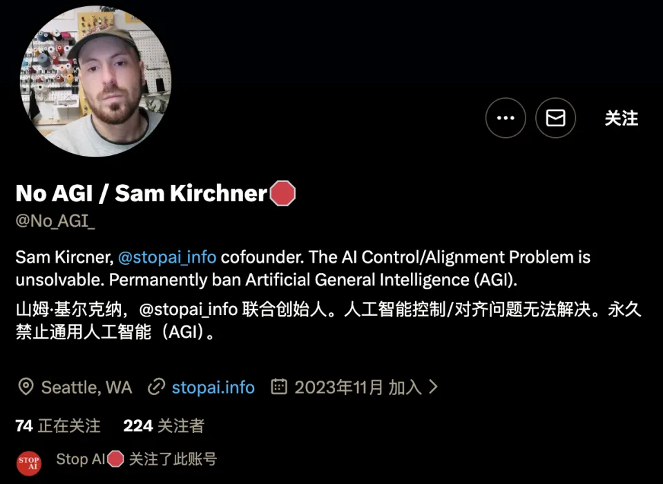 五的上午降临。 故事的另一个主角叫Sam Kirchner。 他是激进反AI构造「Stop AI」的联合首创人。 如果你对硅谷的AI抗议运动有所耳闻,那你也许