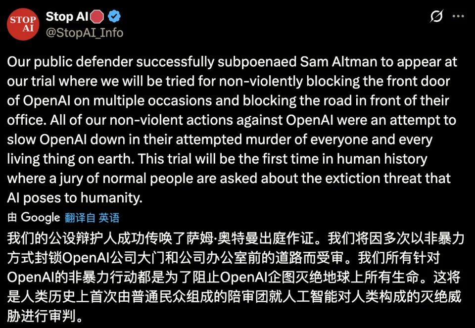 的Logo,现在成了大概招致杀身之祸的靶心。 这场危机并非毫无征兆。 已往两年里,Stop AI、No AGI、Pause AI这些构造像滚雪球一样壮大。 本年2月,就有抗议者由于用链条锁住OpenAI的大门而被捕; 就在本月初,Stop AI的公设辩护状师(Public Defender)跳上舞台,当众向正在接受采访的奥特曼递交传票。 他们原本只是在哲学层面争辩