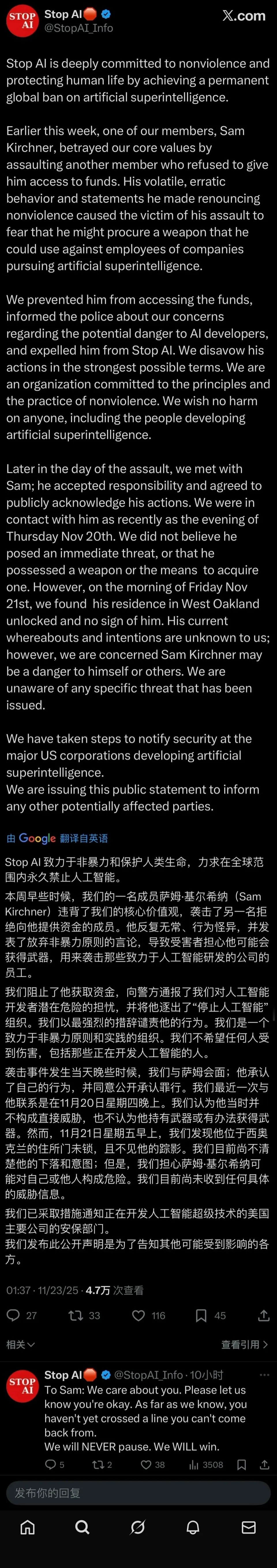,并将他逐出了Stop AI构造。我们以最强烈的措辞谴责他的行为。我们是一个致力于非暴力原则和实践的构造。我们不盼望任何人受到损害