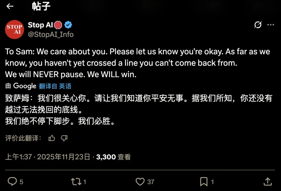 ,Stop AI试图挽回构造形象: 致奥特曼:我们很关心你。请告诉
