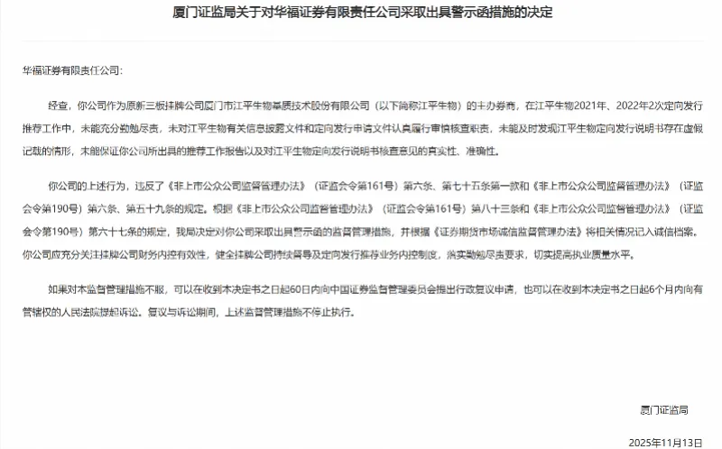 近日,厦门证监局对华福证券出具警示函,因其作为主办券商在刊行 推荐 中未勤奋 尽责,未能查明厦门市江平生物基质技能股份有限公司(简称“江平生物”)在定向刊行 阐明书中存在的财务造假情况。泉源:厦门证监局根据通
