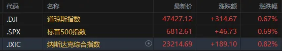 财联社11月27日讯(编辑 赵昊)周三(11月26日),美股高开高收,三年夜 指数均连涨四日。截至收盘,道琼斯指数涨0.67%,报47427.12点;标普500指数涨0.69%,报6812.61点;纳斯达克综合指数涨0.82%,报23214.69点。市