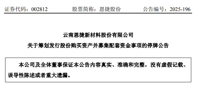 11月30日晚间,锂电隔阂 龙头(002812.SZ)宣布 通知布告 ,公司拟以发行股份等方式购买 (简称“”)100%股权并募集 配套资金,公司股票自12月1日开市时起开端 停牌。公司估计 在不超过10个生意业务日的时间内披露本次生意业