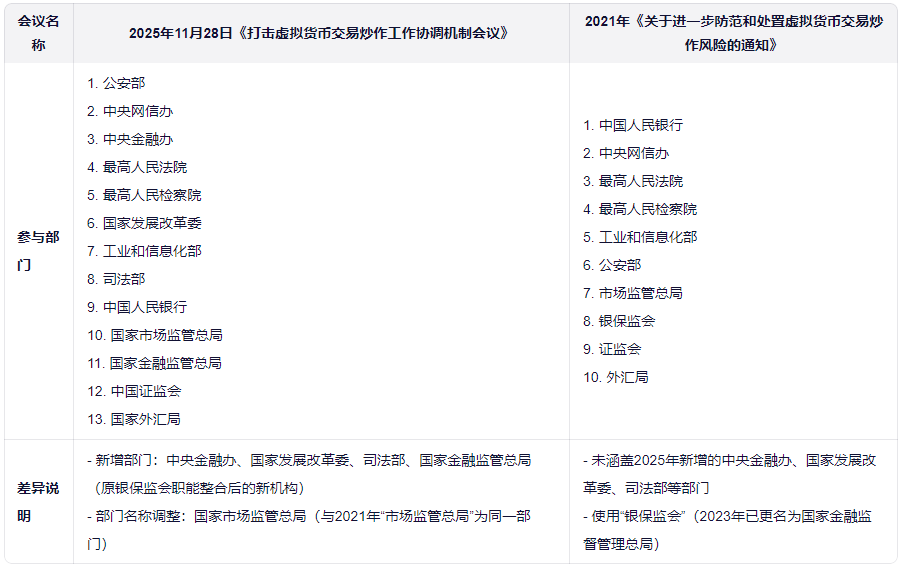 2021年9月,中国人夷易近 银行等十部分团结发布《关于进一步戒备 和处置惩罚假造货币交易炒作风险的通知 》(237号文),初次明确假造货币干系营业 运动属非法金融运动,奠定严格羁系基调;2025年11月28日,央行牵头召开