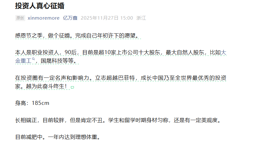 90后游资大佬刘鑫公开辟布征婚启事,激发 市场人士的普遍 存眷 。 12月4日,他新近宣布 了一篇《关于征婚说几句》对该变乱做出了干系阐明。他表现,并不想占有太多"大众," 资源。“我每天工作超过16小时,只有周末大概有