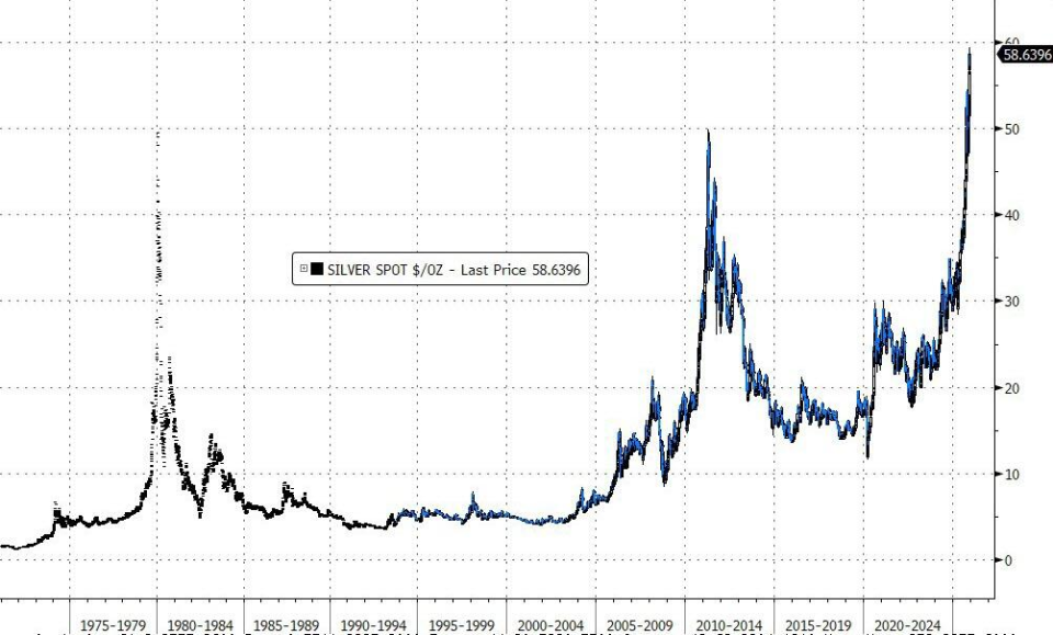 白银代价周五盘中创下历史新高,并实现连续第二周上涨,ETF的强劲流入为这轮火热涨势注入了更多动力。 周五现货白银一度上涨3.9%,创下每盎司59.33美元的历史新高。 (白银突破59美元大关,创下历史新高) 白银ETF的资