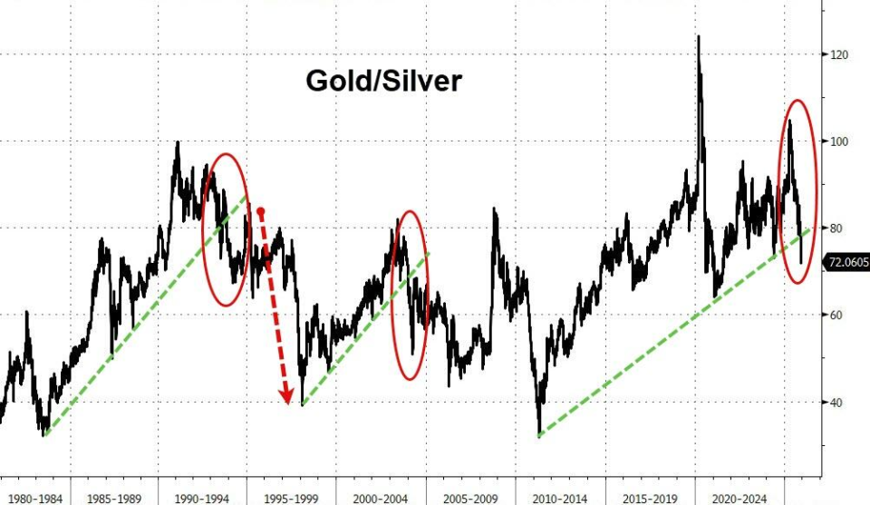 周五黄金走势则出现分化,日内冲高1%后转跌。这使得金银比价回落至2024年5月低点以下,约为72倍。 Vantage Markets分析师Hebe Chen表示: