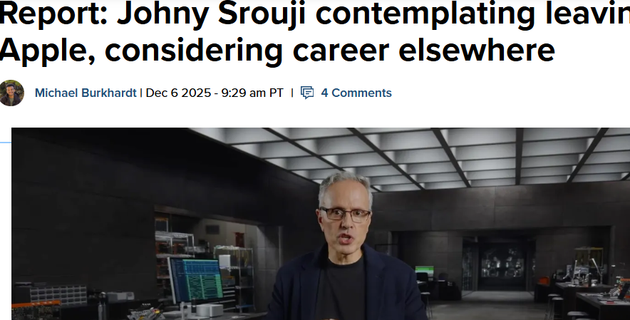 【环球网科技综合报道】据彭博社12月7日报道体现,苹果硬件技术高级 副总裁约翰尼·斯鲁吉正“卖力 思量”离职,这位苹果自研芯片的焦点推动 者若最终出走,将成为短期内第五位官宣脱离的苹果高层。斯鲁吉主导的苹果芯