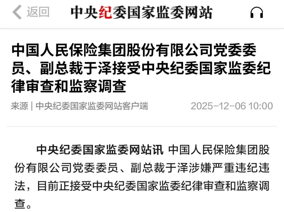 文 |俞燕编 |吴戈出品 |喻观察掉 联新闻 发酵整整一周后,CCDI公告回声 而至,正式颁布 了“鸽王”于泽掉 联后的了局。公告披露,12月6日,中国人平易近 保险集团股份有限公司(下称“中国人保”,601319.SH,1339.HK)