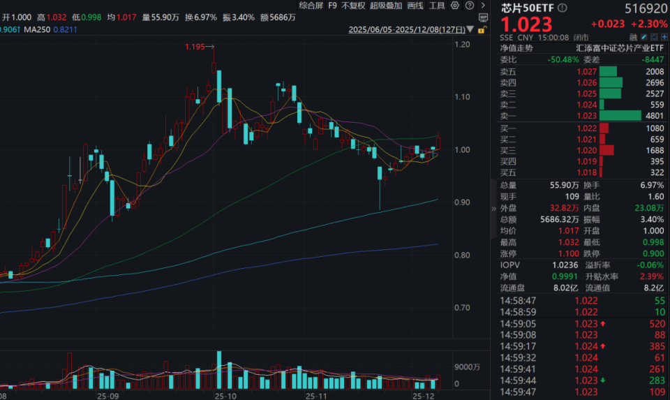 本日(12.8),A股放量劲升,芯片板块走强,全市场费率最低档的芯片50ETF(516920)收涨2.3%,全天成交额超5600万元!资金面上,芯片50ETF(516920)近5日有2日获资金青睐!芯片50ETF(516920)标的指数身分股多数飘红:寒